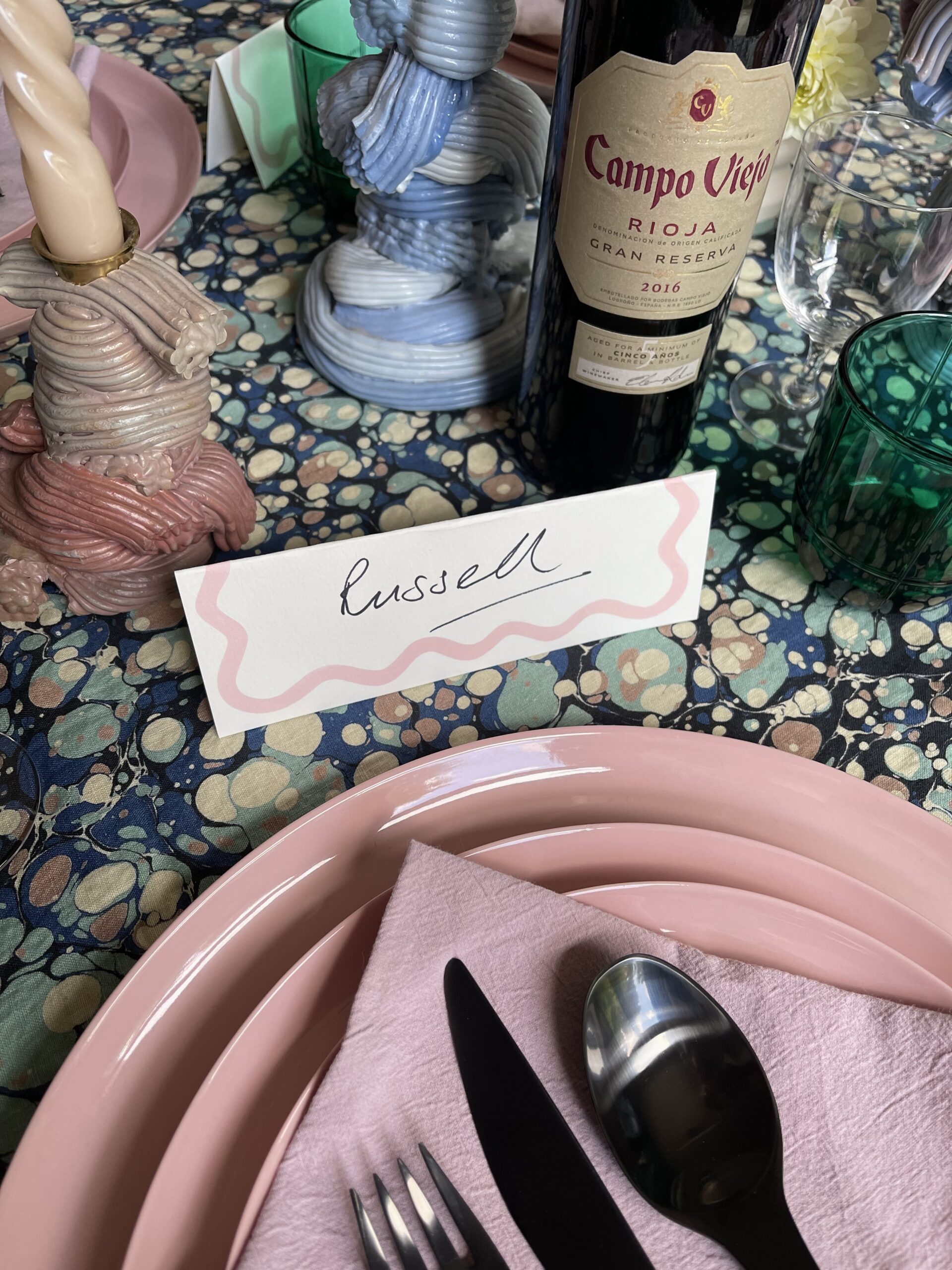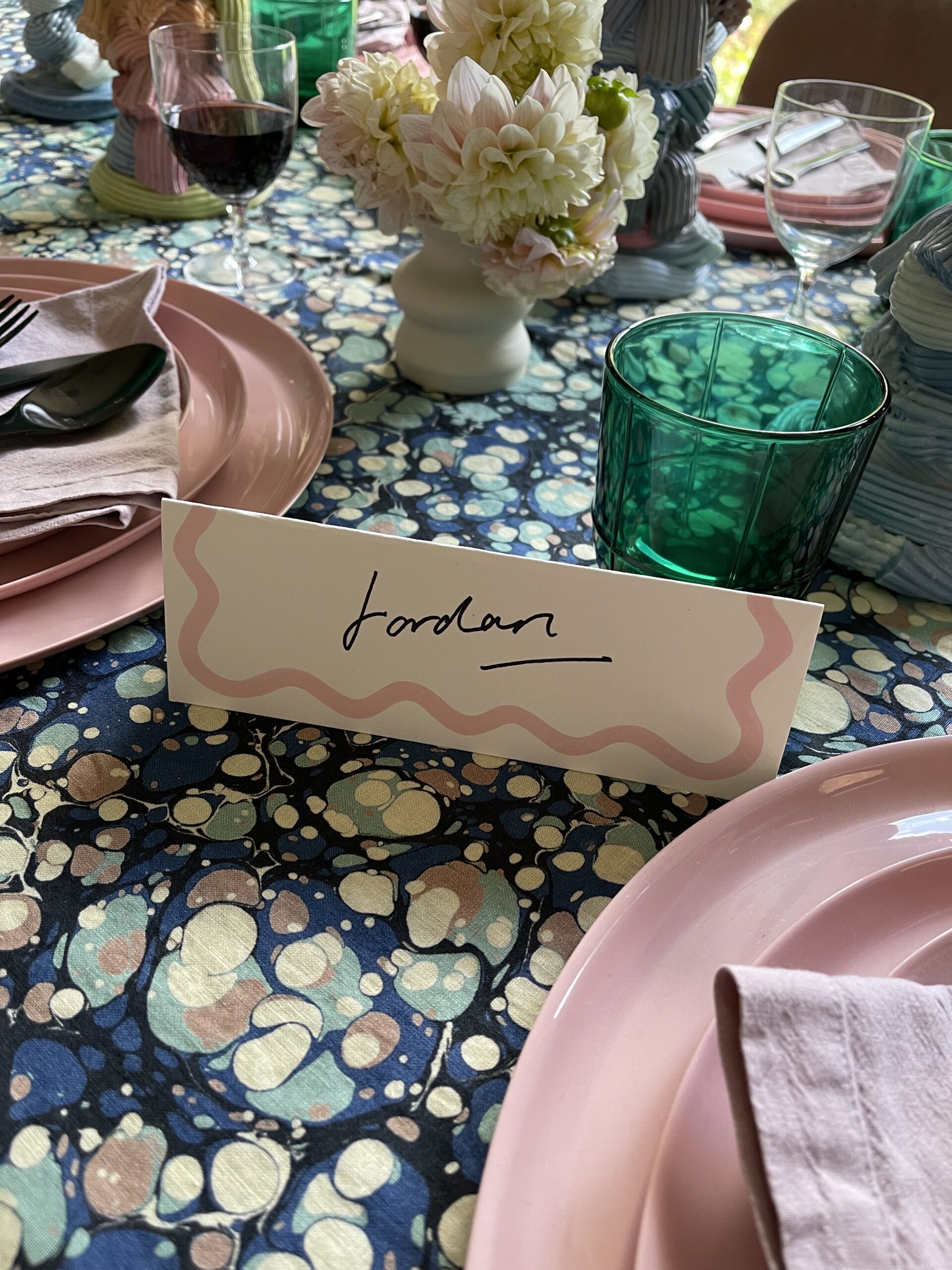 Layer up the textures - a beautiful printed tablecloth, natural linen napkins and glossy pink porcelain.