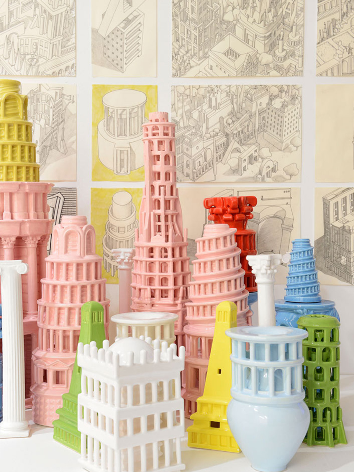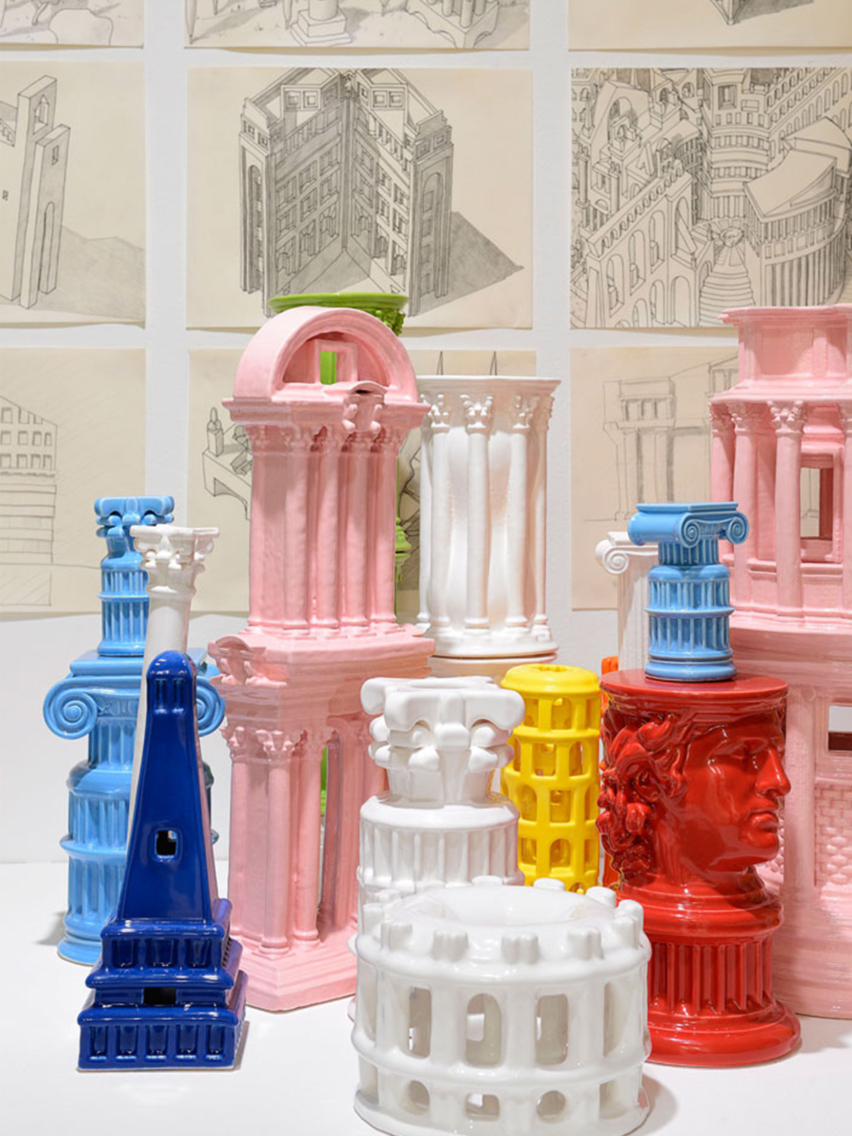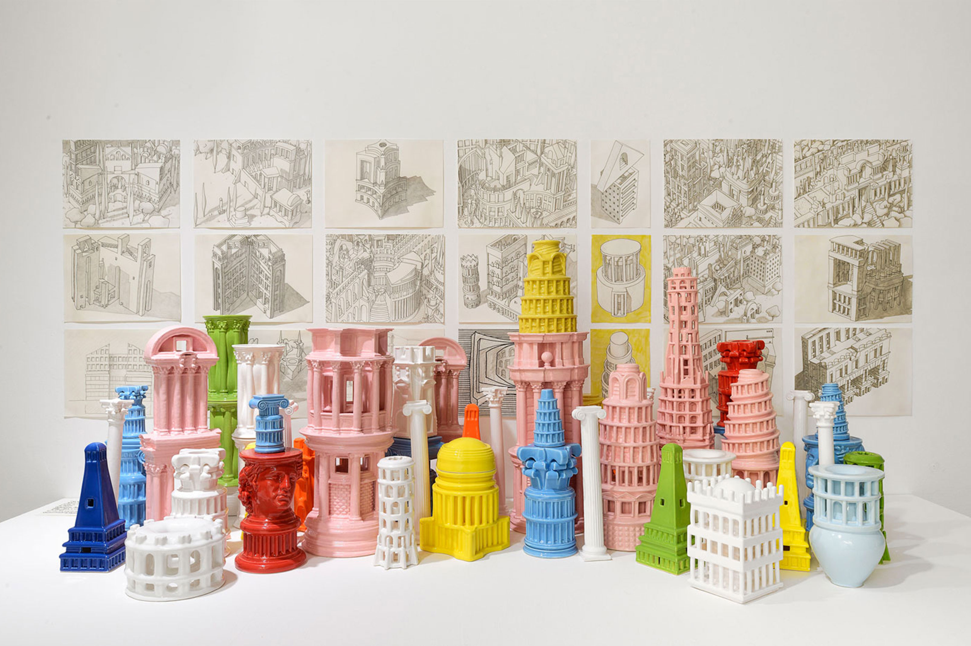 I love Rome, I am obsessed with Rome. I can safely say getting a scholarship there in 2005 changed my life as an architect. For me it is the physical, ancient equivalent of the internet. There is so much stuff, from all eras of architectural and artistic history, scattered all over the place, in such wild abandon, and submerged within the pulsing life of a busy, wild city, that it collapses in on itself, and history ceases to matter, ceases to be a chronological thing. Instead, all architecture, all art is equal, it is comes into the present and becomes something to be experienced, something that one can allow to wash over you as you wander around. Like the internet it allows itself to be surfed, but similarly, at any one point or place, if you ask any questions, research a little bit, every single building throws up incredible amounts of stories, of history, just as every wikipedia page can send you deeper and deeper into incredible channels of information and knowledge. I won the UK Rome Prize for Architecture 2014-15, and while living at the British Academy there for 6 months, went on numerous long walks. On these I would discover specific stories, which I would research and elaborate, and then design little architectural scenarios for. I would also draw Capriccios, or intuitive imaginary compositions, that would compress all the things I had seen on the days walk into a small made-up world of specific shapes and forms. Later I brought each of these stories together with one of the Capriccios, and would turn their combination into a ceramic building that embodied them, a souvenir of my experience and research. All of these ceramic buildings came together in the end to create a Souvenir City In Ceramics, my gift to Rome, a physical manifestation of my six month Grand Tour around the city.