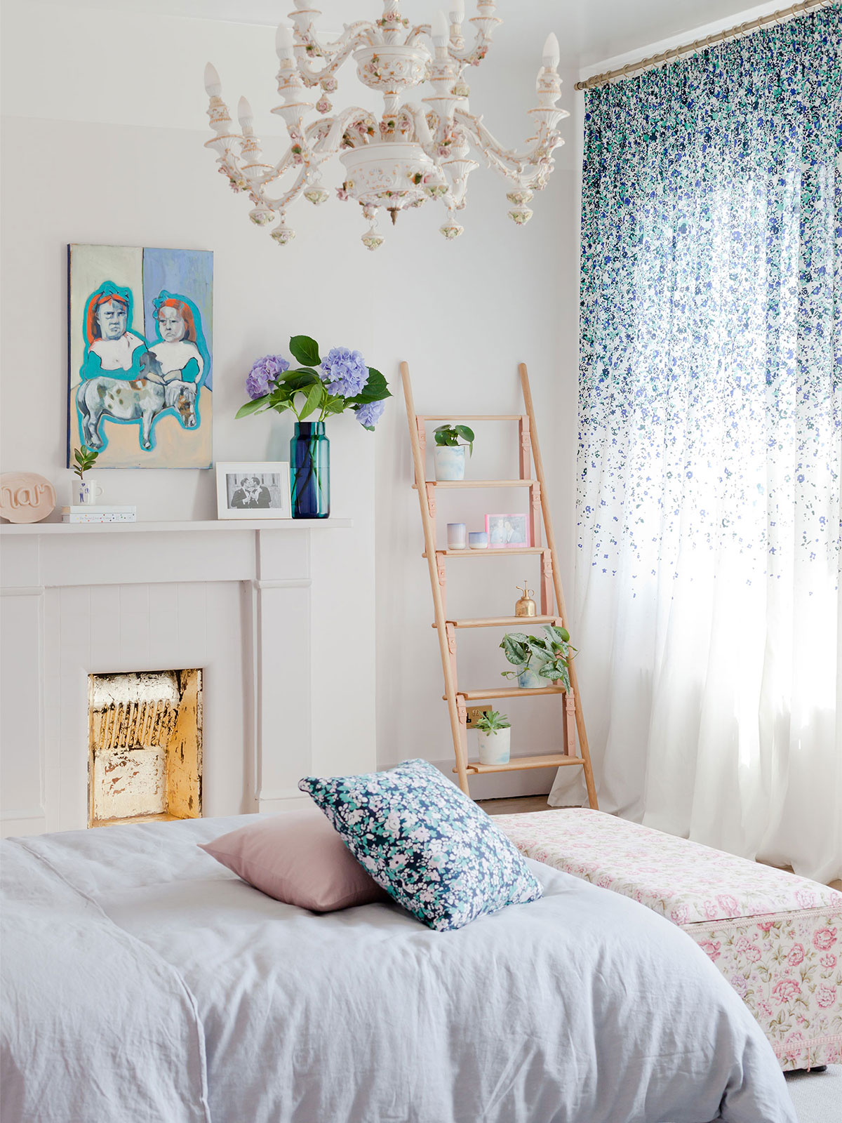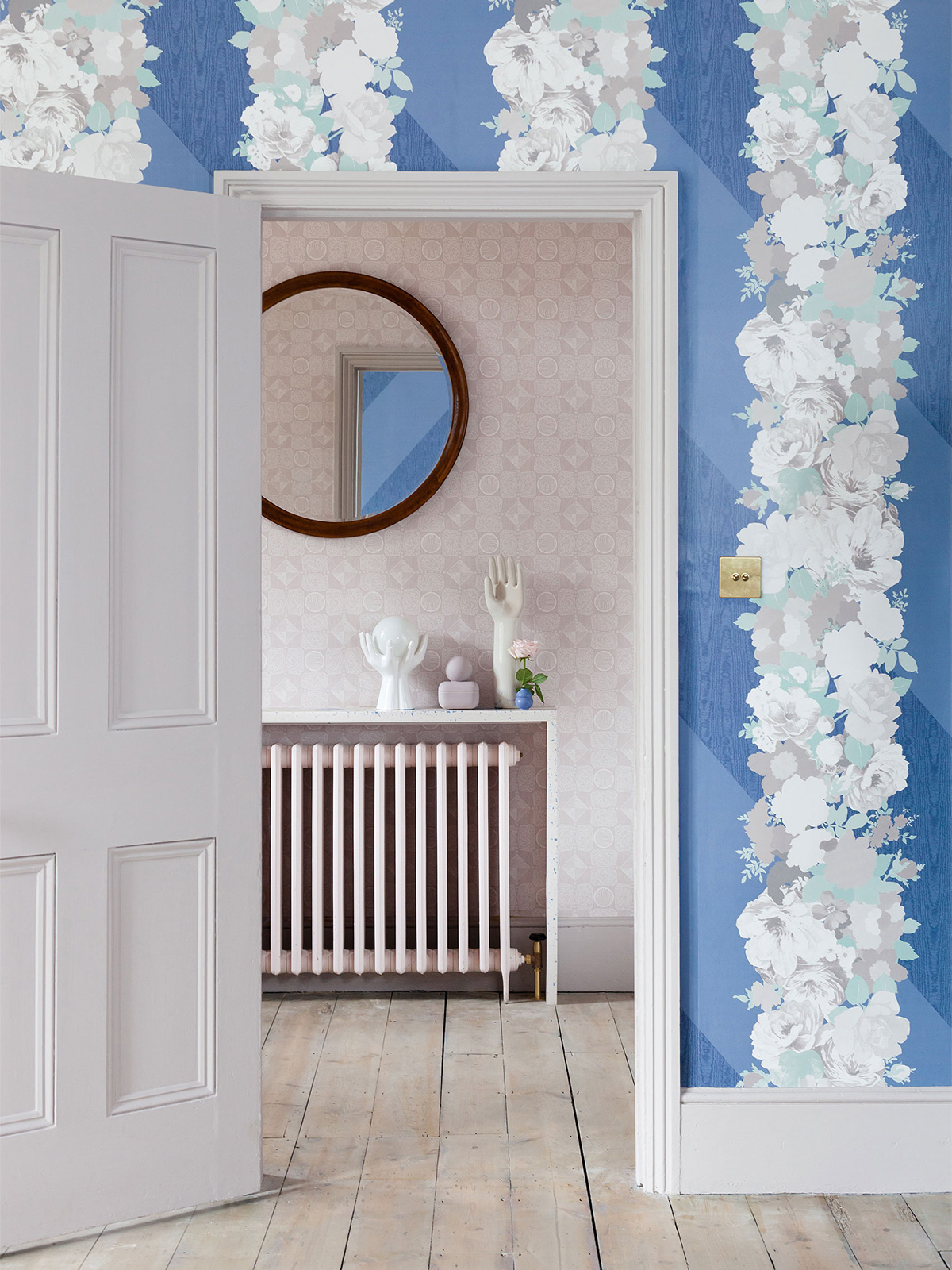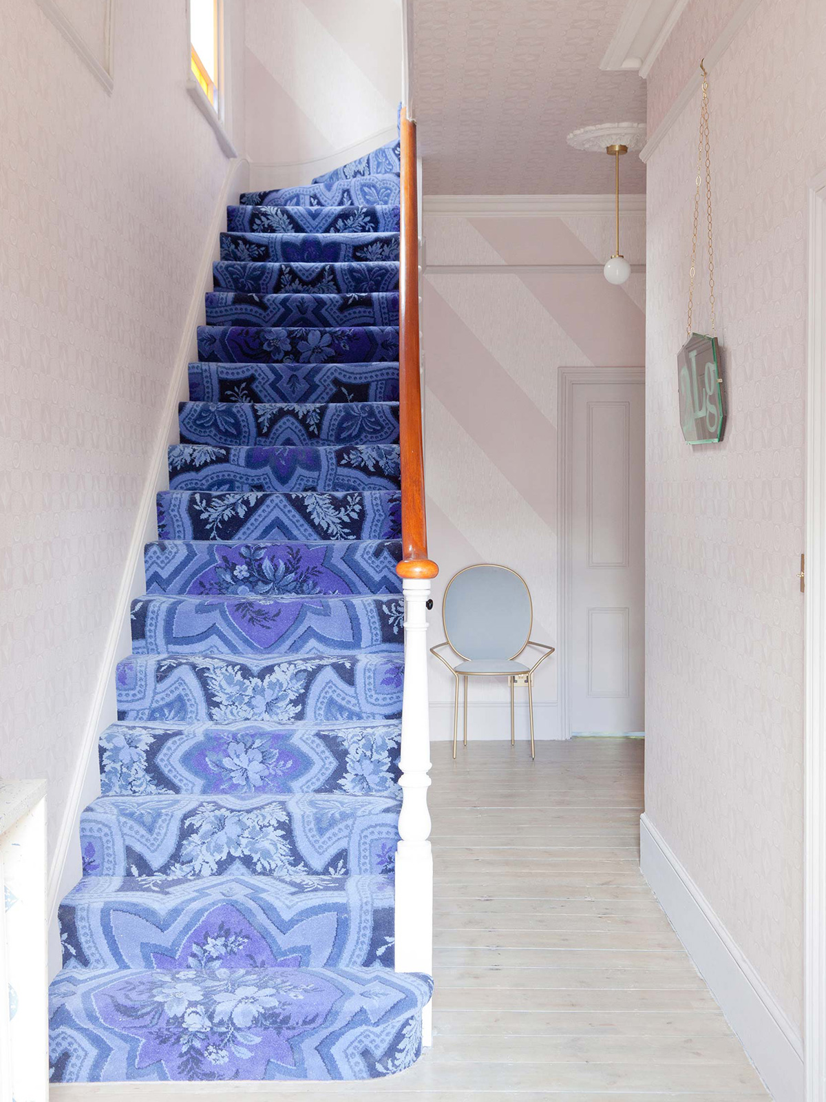 Pattern used on a grand scale can still give a minimal look if the lines are clean and the palette is limited. In the entrance hall of our ongoing passion project, Perry Rise, we have used our Wallpaper and carpet collaborations to wrap pattern on every surface, giving a minimal look even though the use of pattern is maximal. The approach is more maximal in the bedroom with a wall of patterned curtain amongst other eclectic elements, but the bones have been approached in a minimal way with a pale colour palette.