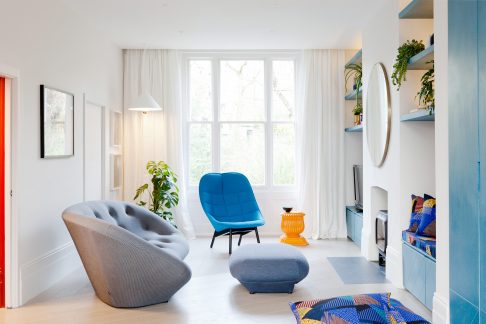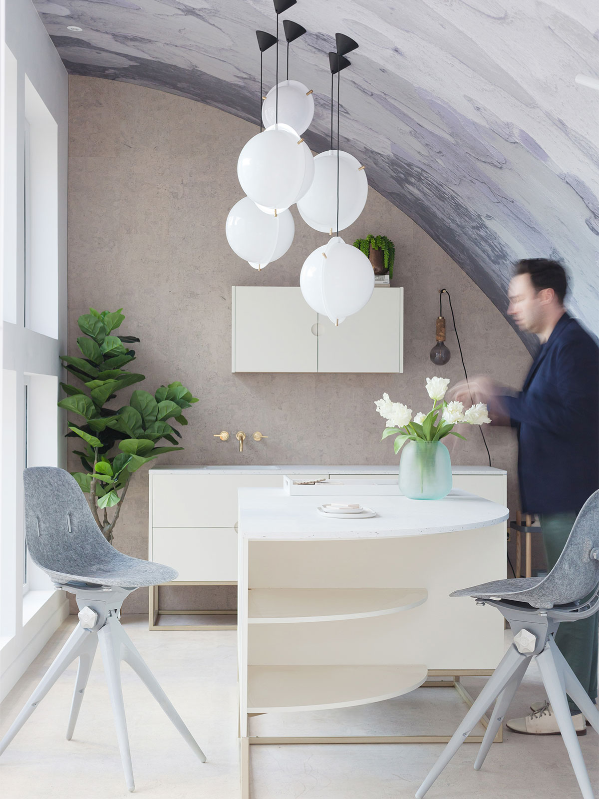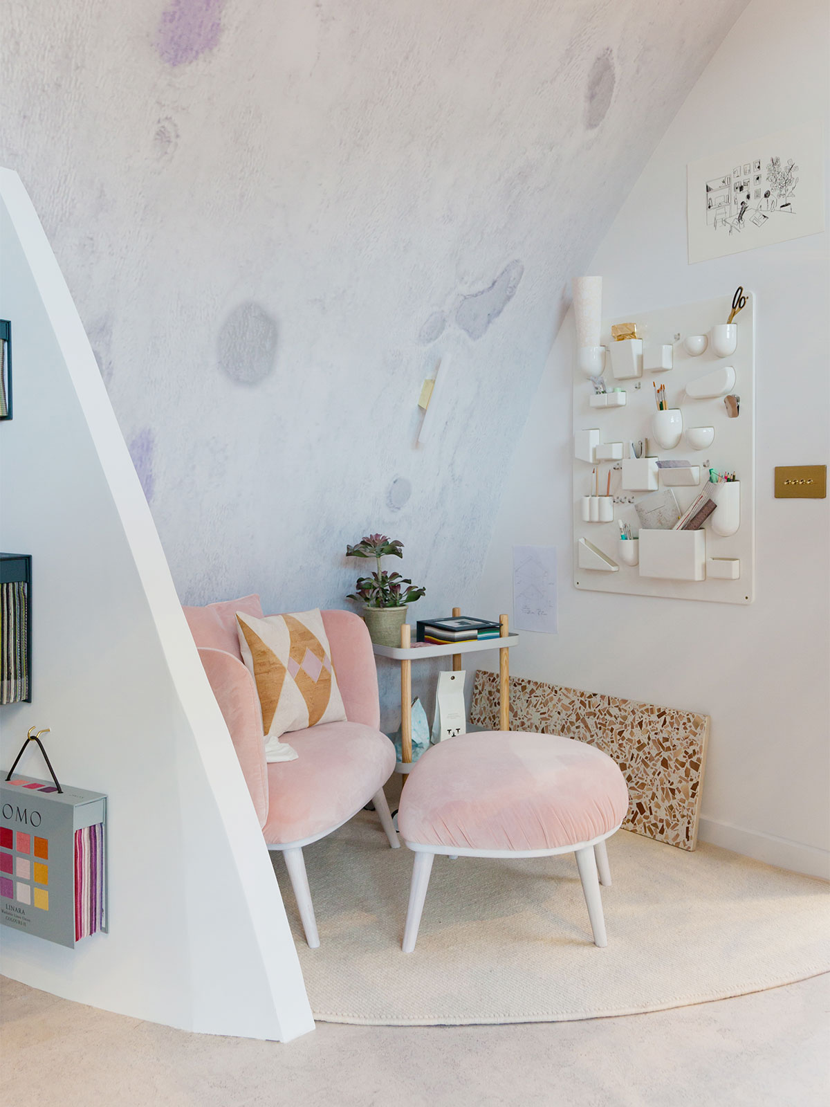 The quadrant shape of the pod informs the curves of the kitchen island and also a fin-like wall that acts as a room divider, creating a breakout snug for reading, relaxing, thinking or perhaps taking a business call. You might also want to welcome a client in this area. The shape is defined further by the bespoke floor rug by crucial trading adding more softness and texture. The other side of the fin also houses a fabric library, courtesy of Romo, on simple brass hooks from a local hardware store.