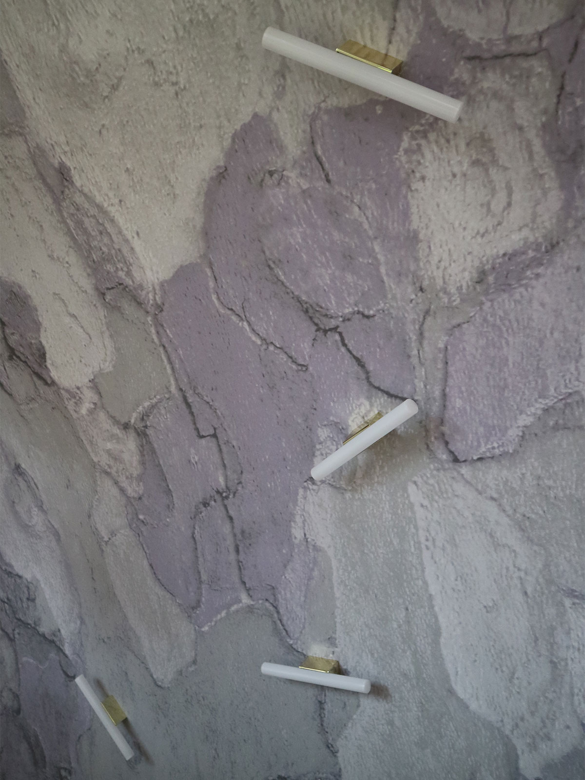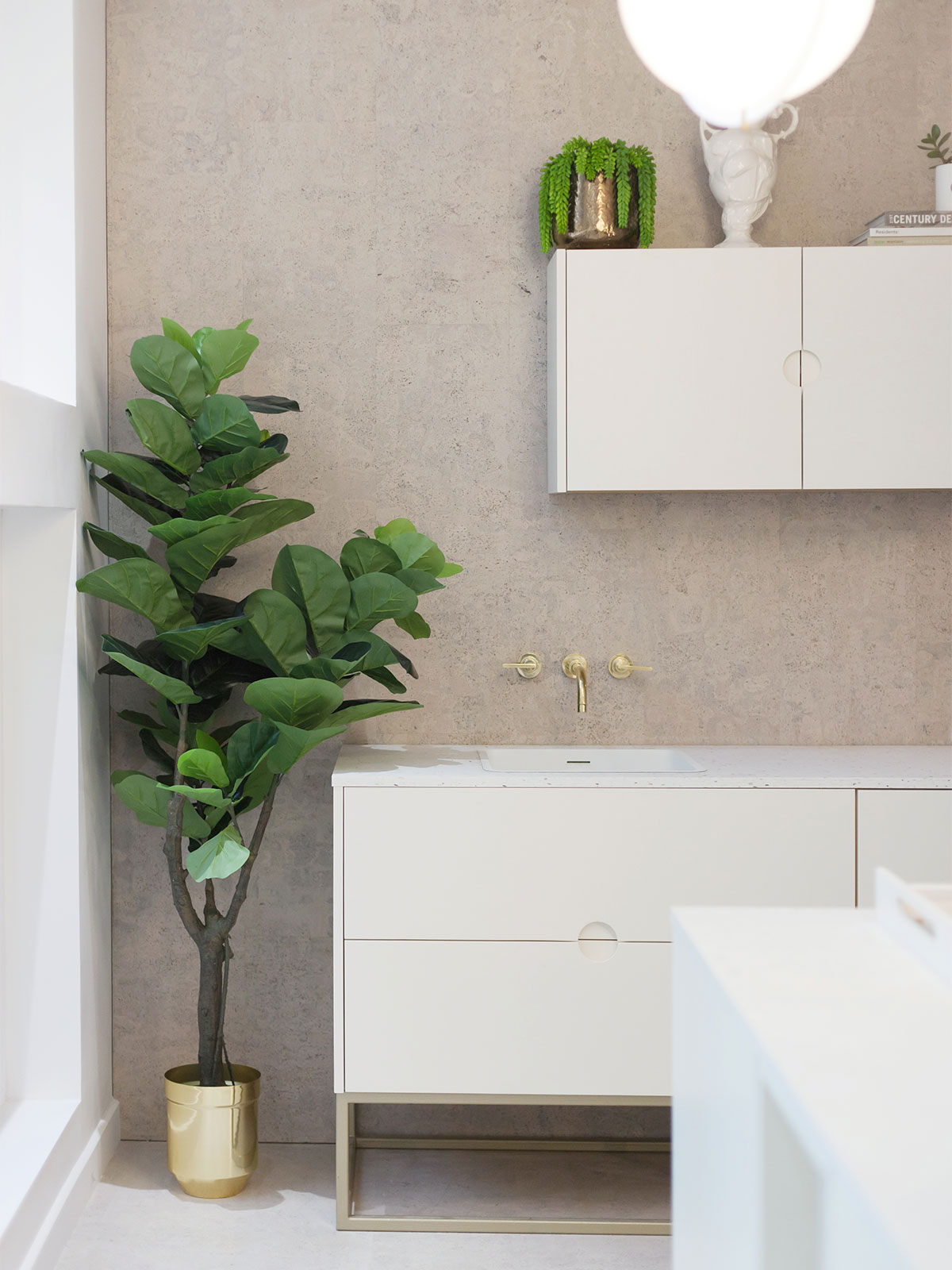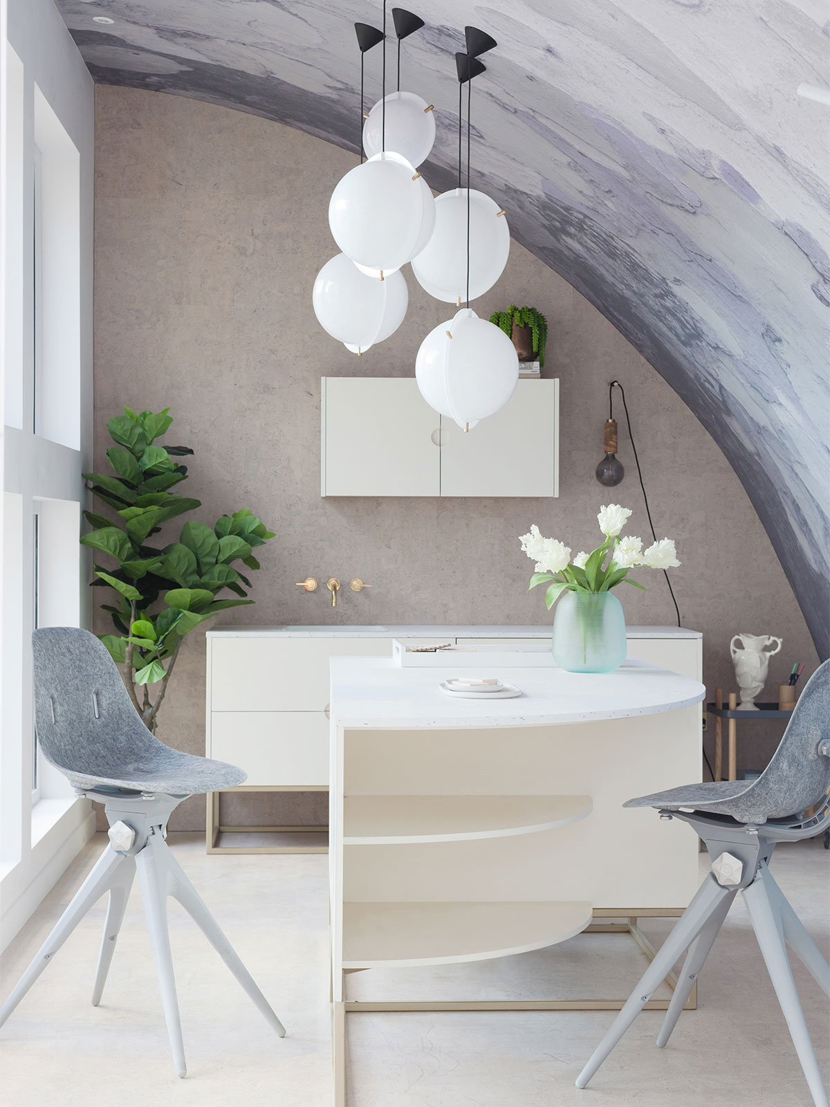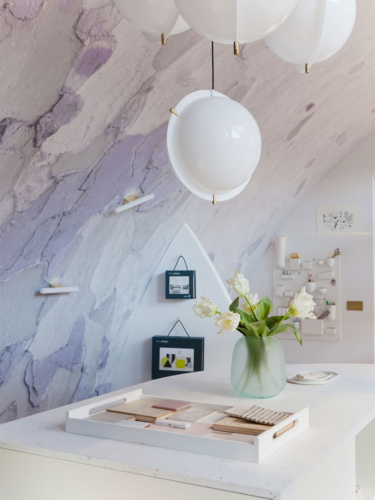 London Plane is the most abundant tree in London and we took a series of photos of a particular tree outside the V&A Museum. The characteristic patterns and colours of the bark caught our eye and when we got back to our studio and looked at the images we had taken we realised it was a truly beautiful texture. One that we wanted to live with since it reflects nature in the most wonderful way. A new way to connect you to nature in your home and at first you can’t tell what it is, even though it is so familiar to you. Looking again at something that is part of the texture of our environment. A tree that we perhaps take for granted, gives you something so beautiful when you really look at it. Turning it into a series of murals as part of our new collection, we recoloured elements to create a new must have interior wallcovering, perfect for a more mindful space. In the setting of this pod it almost gives a cave-like quality, but with a freshness that feels very uplifting. The lilac greys and soft greens of this colour way we have designed, is calming and pairs beautifully with the White kitchen.