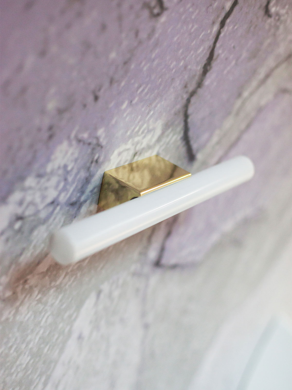 Working closely with Naked Kitchens ( british manufacturer of solid wood kitchens) we designed a bespoke kitchen, complete with unique 2LG handle details and gold legs to make it freestanding. The drawers are deep and wide to store equipment and samples and there is a long cubby in the island/workstation to house fabric and wallpaper rolls. The worktop is by Smile Plastics (you may remember them from our bathroom design for our Granville Park interior project) and is made from recycled plastic – perfectly tactile and wipeable for a creative studio space.