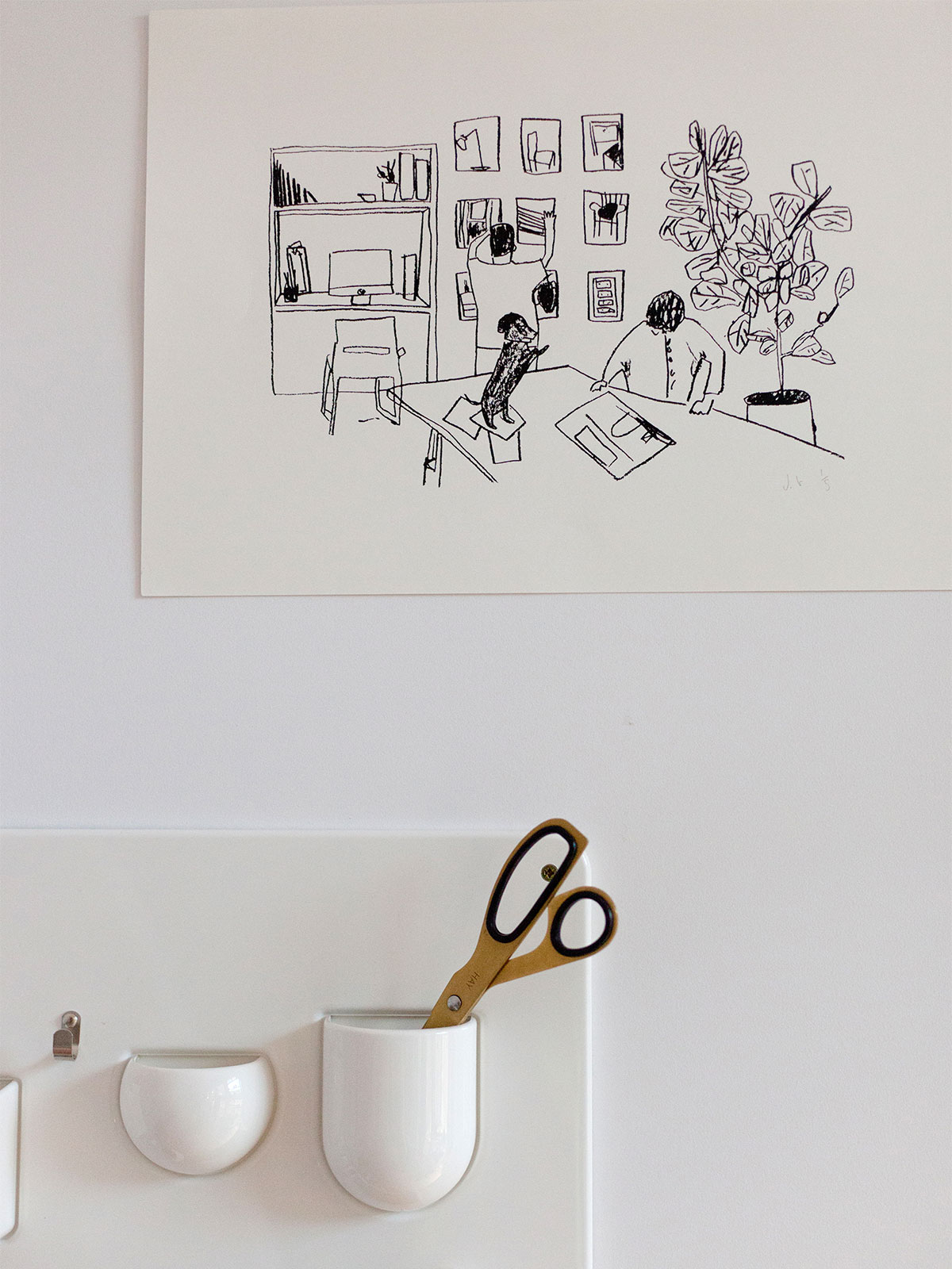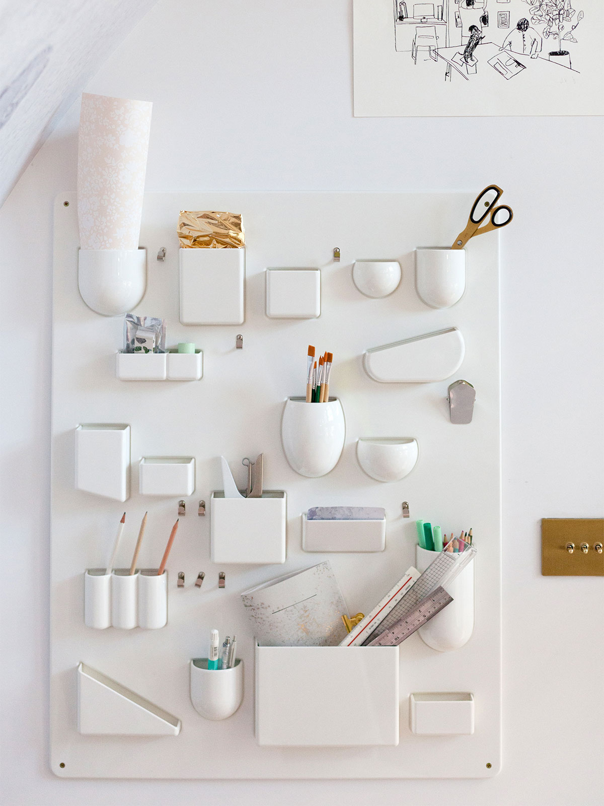 This area becomes a useful storage space too with the beautiful and practical 'Utensilo' wall unit by Vitra in gloss white. Such a pleasing way to store your stationary. Utterly classic.