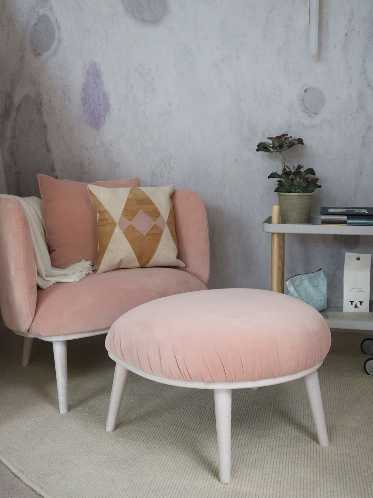 The furniture is by Love your home. We had their elegantly curved Isaac armchair and poof made with white washed wooden legs to fit in with the simple scheme and upholstered in their pink velvet to give our signature touch of colour. Finished off with an amazing cork cushion from Mind the Cork.