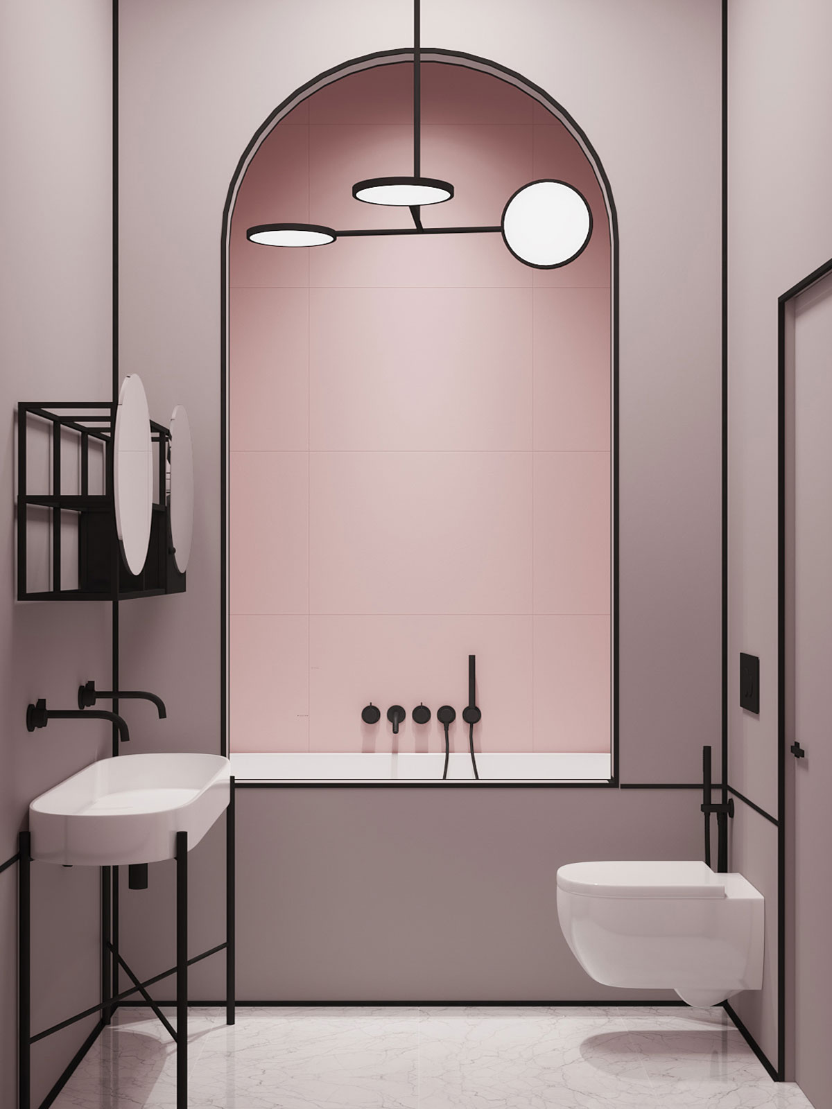 We were also inspired by italian design and our trips to Milan as well as the imagined interiors of Artist Charlotte Taylor and the pink bathroom render below, designed by Crosby Studio.