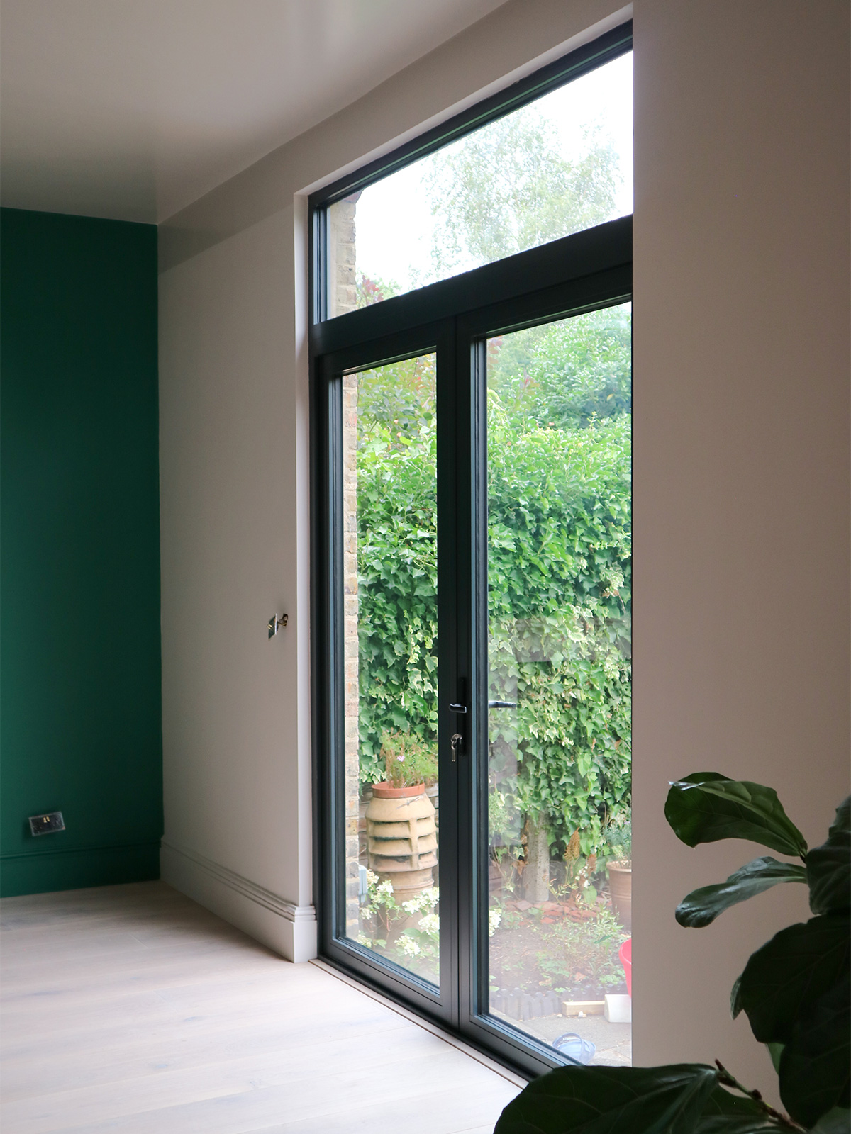 So, first things first, our rickety, drafty old wooden doors and windows had to go, before we could put in new plaster and paint. It is a big job and one that we took a lot of time over. In the end we have opted to stay true to the lovely brick arches outside and keep the proportions of the doors and window, original. We have put in modern units by the lovely team at ODC Glass of anthracite grey aluminium, which not only open fully to give us a major garden connection at the back when they are open but they are also giving us major extra warmth and security. The previous doors were so old that you could have pushed your way into our house easily. Now we feel so much safer. Amazing what a pair of doors can do.