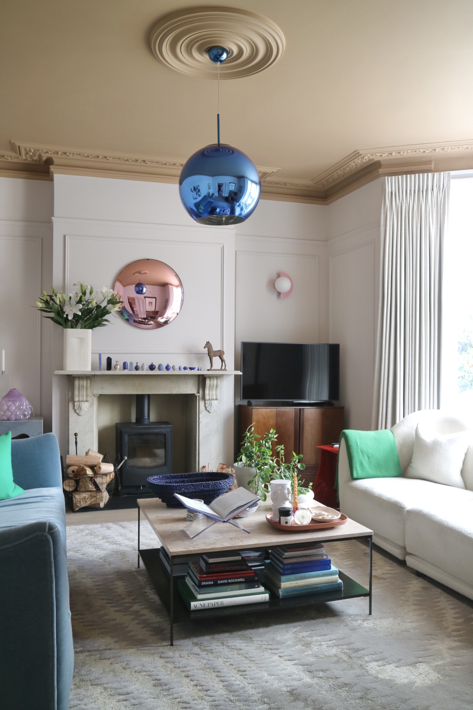 Our original Tom Dixon light and wing back chair remain in the space, with some simple updates. A new ceiling rose and colour that makes the pendant light pop even more than before.