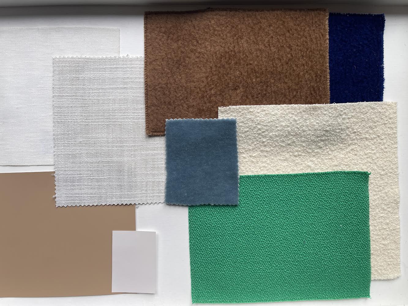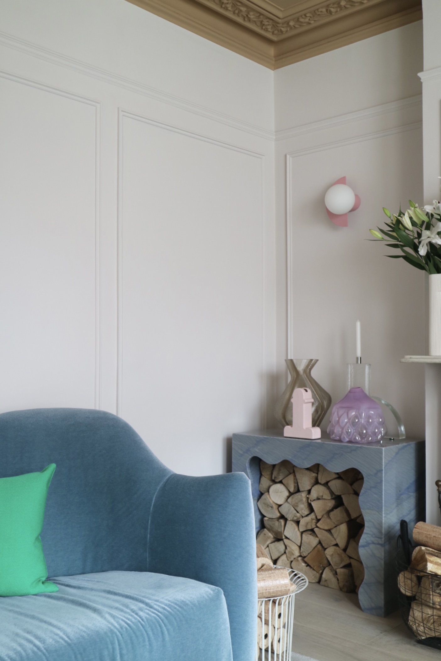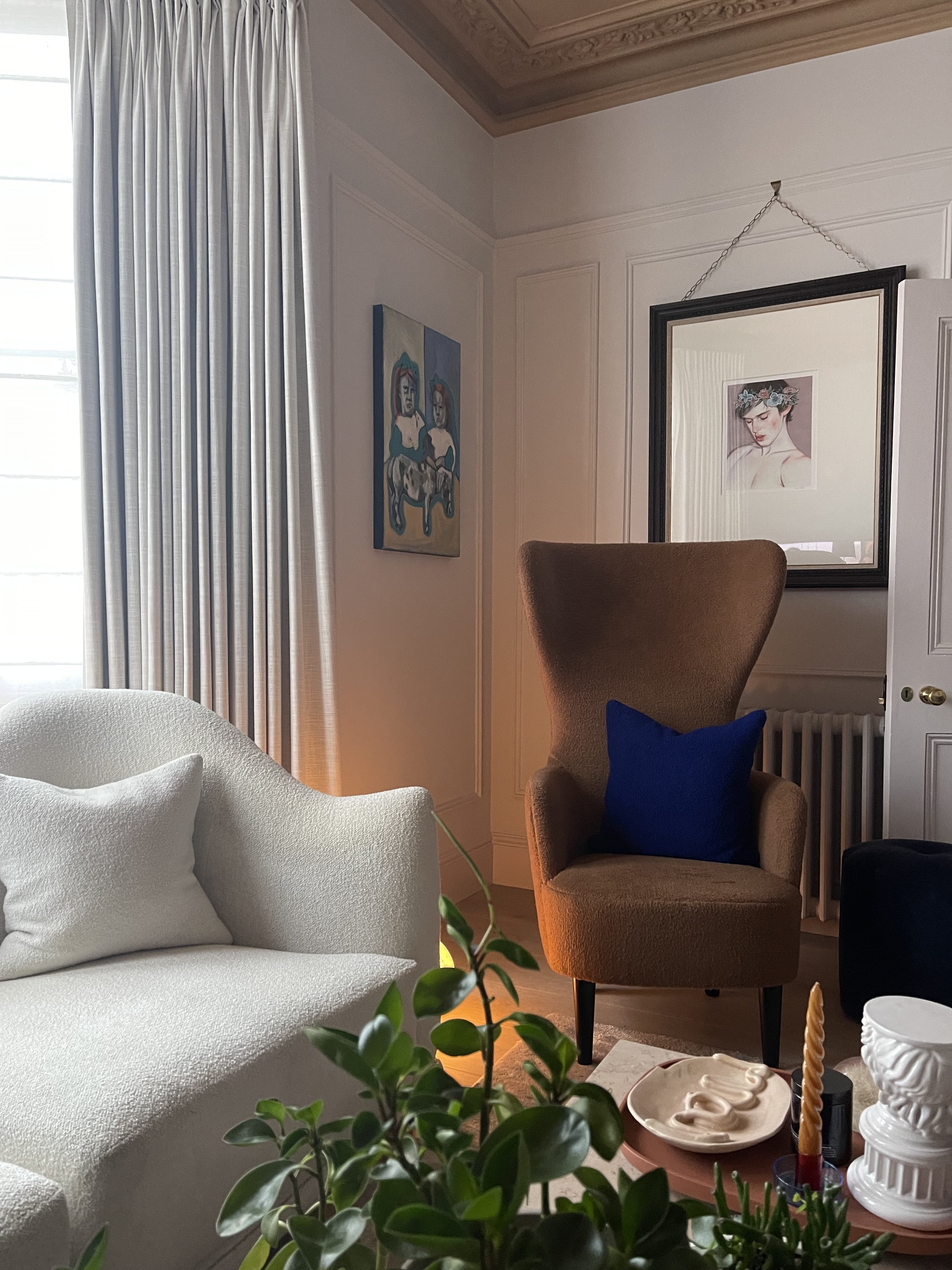 The sofa, our Tilda design with Love Your Home (available here) has been newly upholstered in bluebird velvet bringing more colour into the space and the Tilda armchairs in off white boucle sit into the curtained bay window area beautifully, carrying the curvy lines of the design across the room.