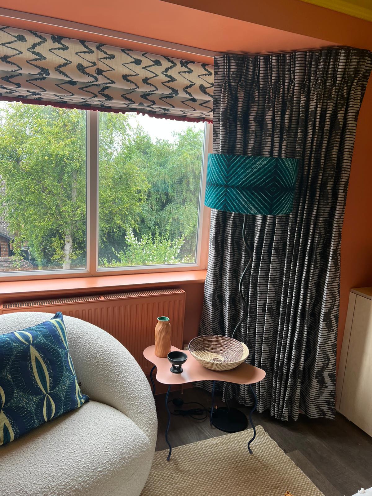 This was all softened by the richly layered window treatments. Grounding the rich colours of the room with black and white texture.