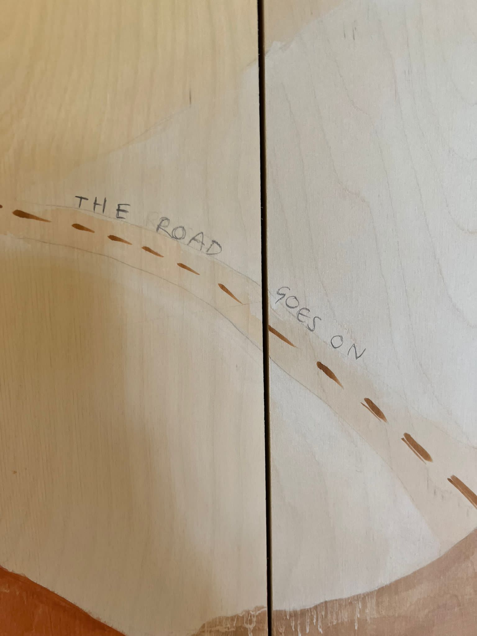 Many elements of our design involved us using painting or drawing elements and it was so hard to not be there... Not least the big mural on plywood, involving painted landscape and pyrography motifs. A plane we sketched as a witty nod to the Luton location made it onto the wall.
