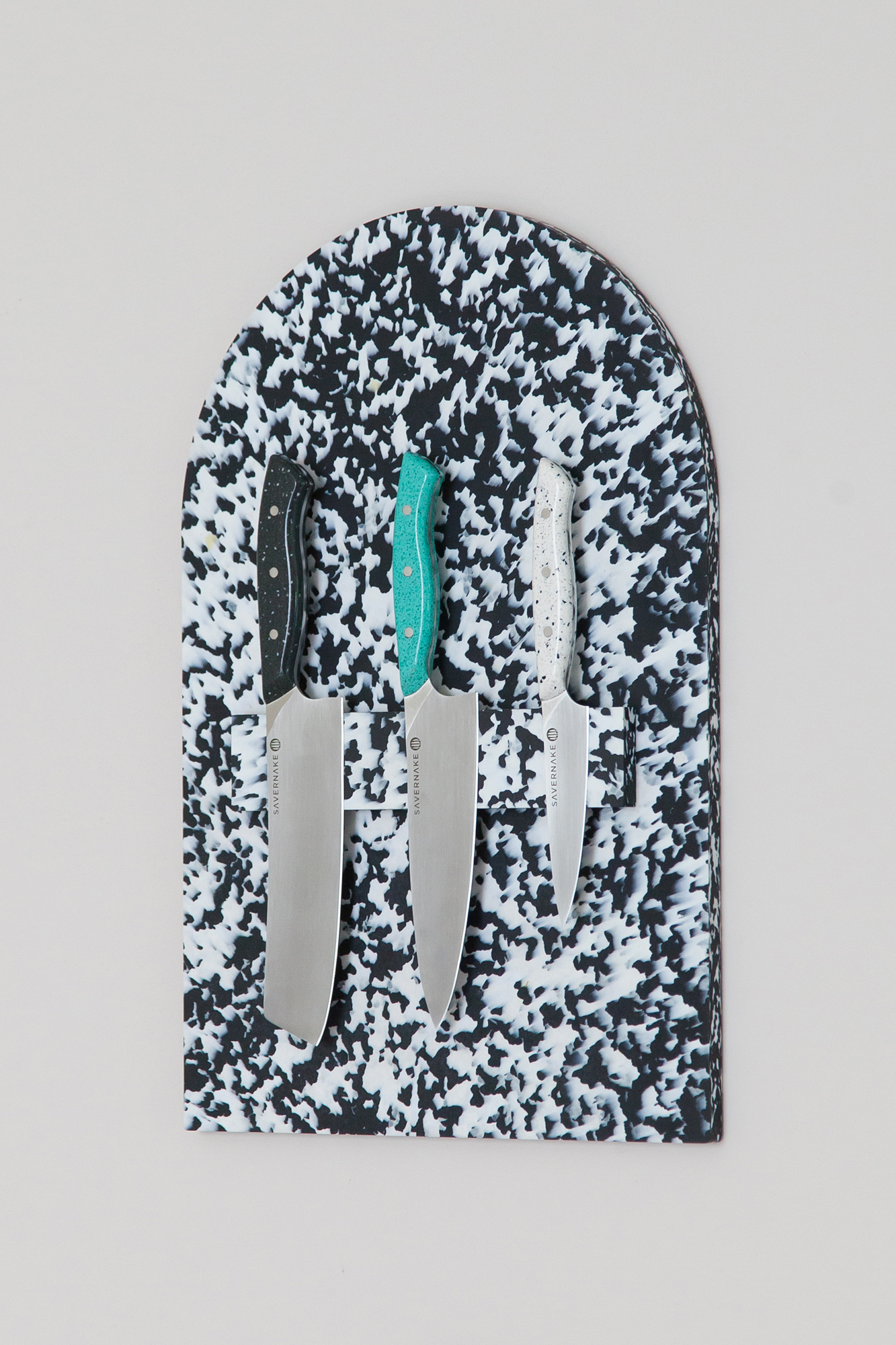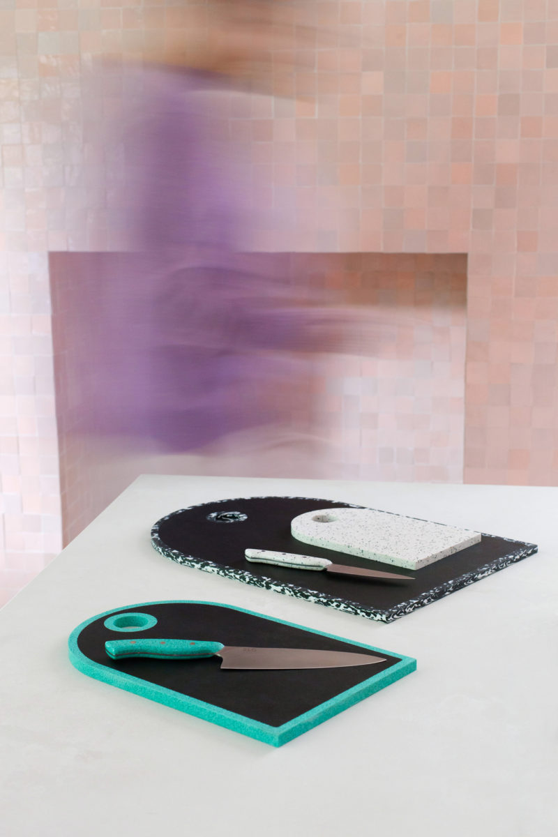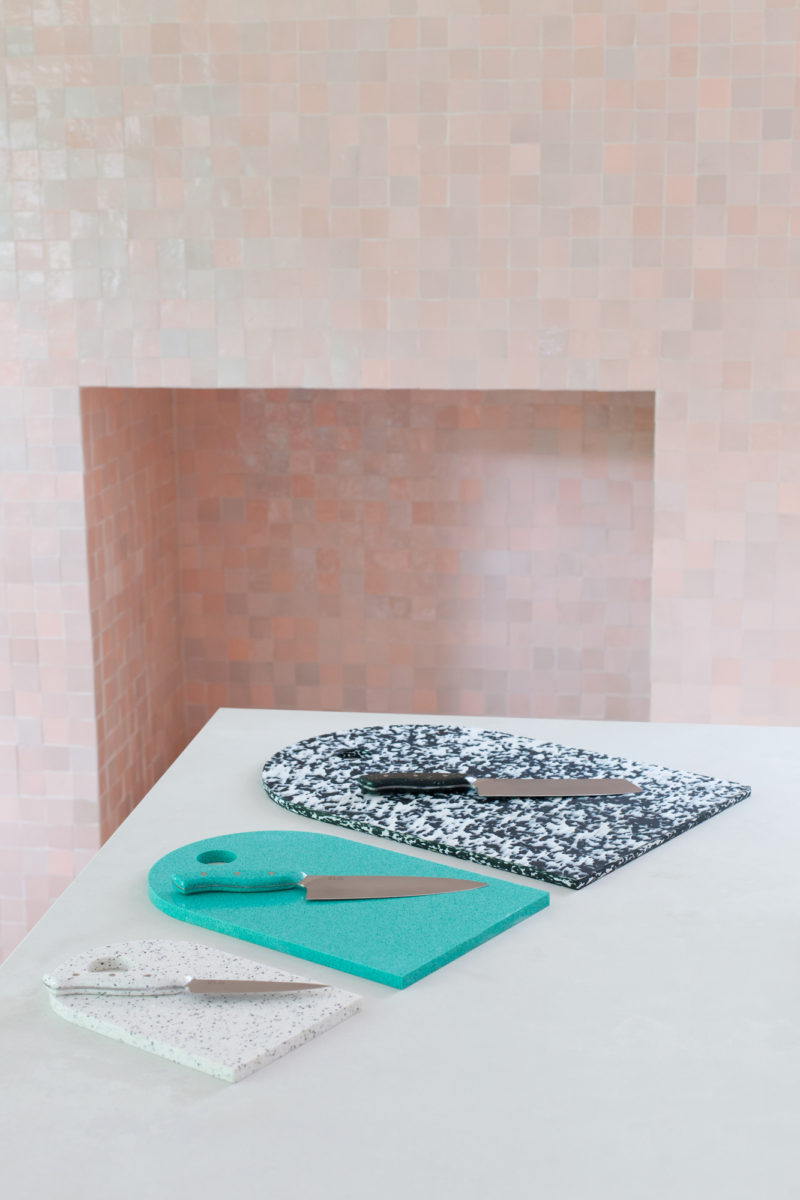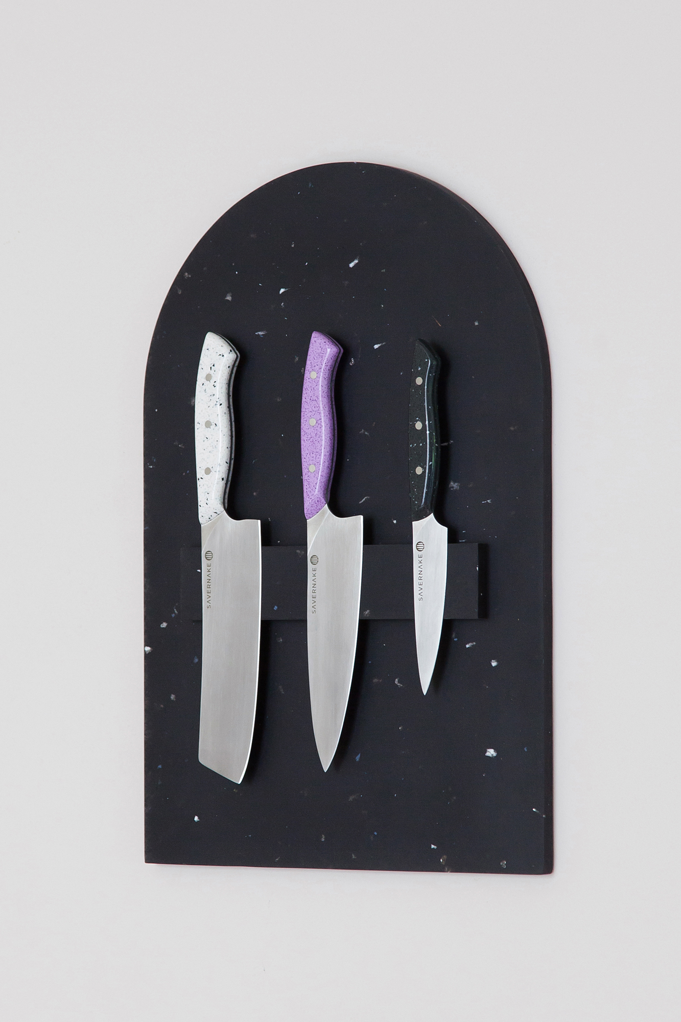 Our design combines bold shapes with strong colour and material choices. The combinations of materials are beautiful and functional, with recycled plastic, post-industrial composite waste and compressed paper making the knife handles, display boards and chopping surfaces in this collection of 3 knives and 3 boards.