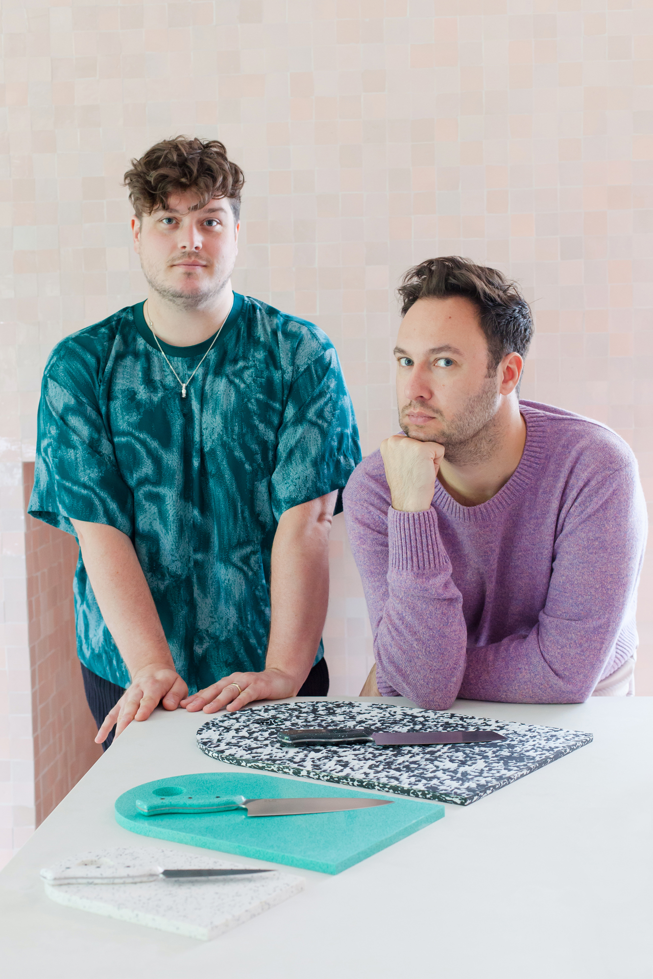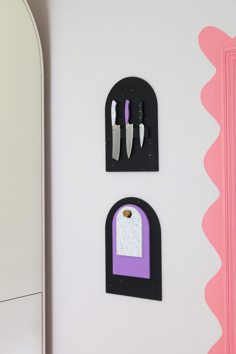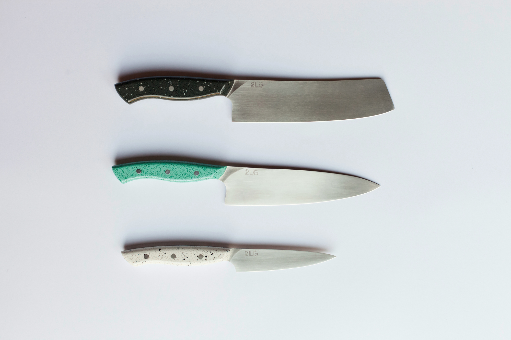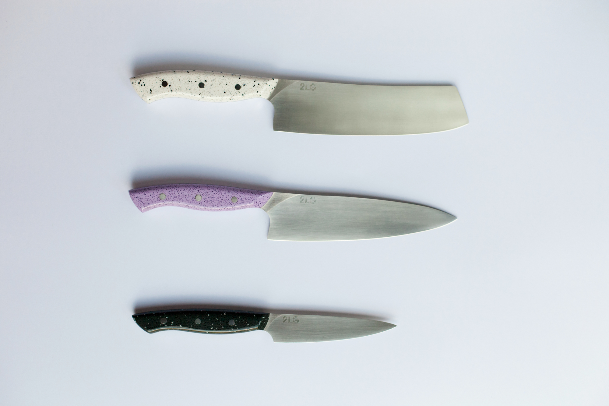 Our design combines bold shapes with strong colour and material choices. The combinations of materials are beautiful and functional, with recycled plastic, post-industrial composite waste and compressed paper making the knife handles, display boards and chopping surfaces in this collection of 3 knives and 3 boards.