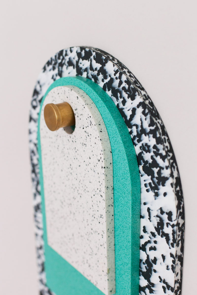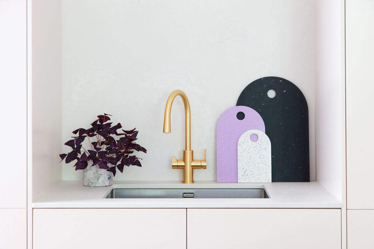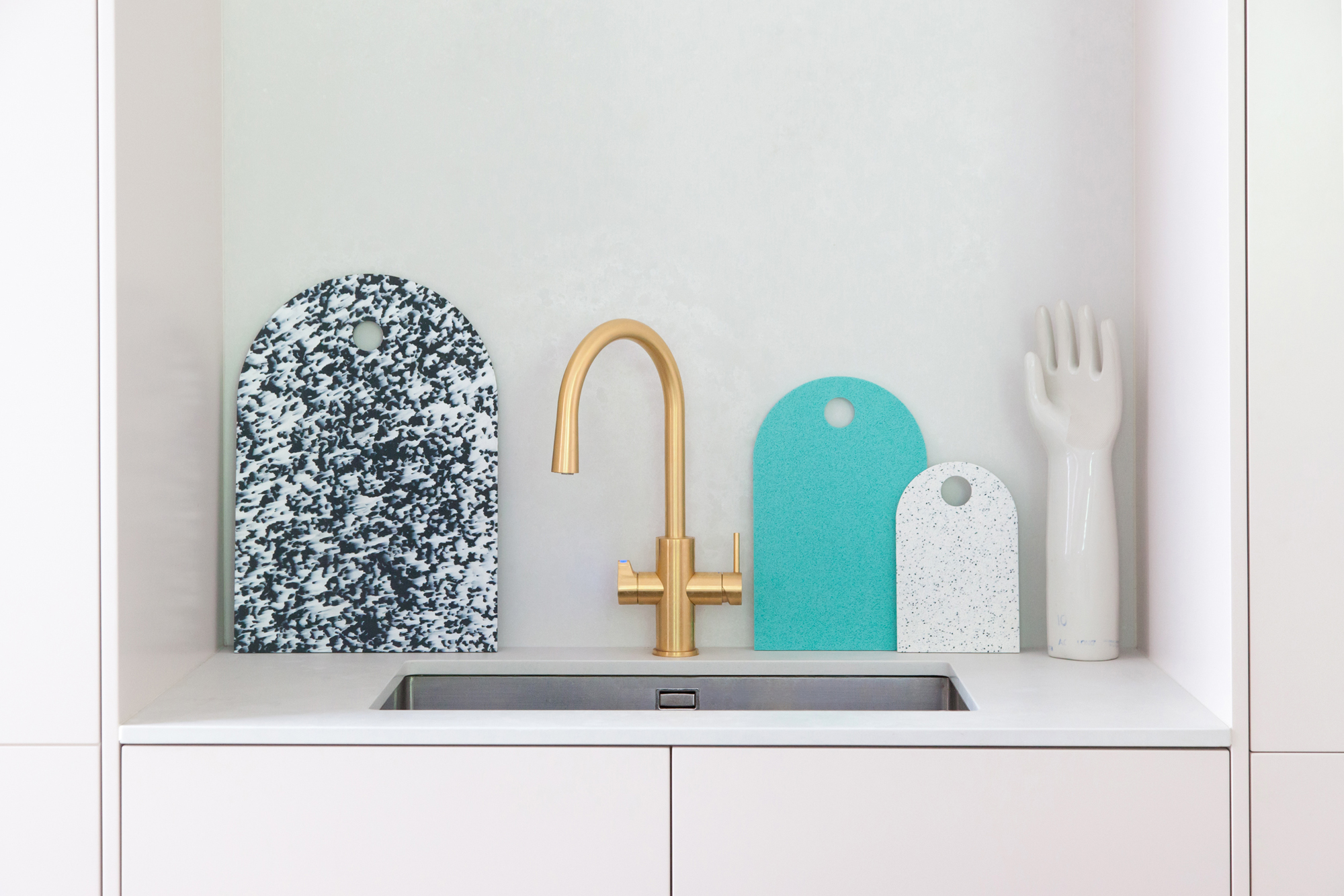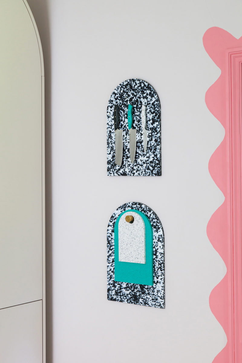 Our design combines bold shapes with strong colour and material choices. The combinations of materials are beautiful and functional, with recycled plastic, post-industrial composite waste and compressed paper making the knife handles, display boards and chopping surfaces in this collection of 3 knives and 3 boards.