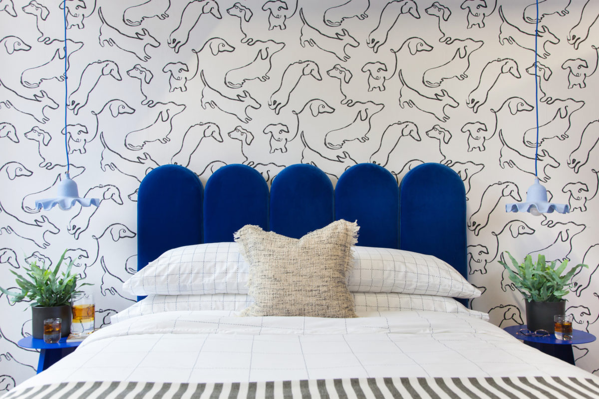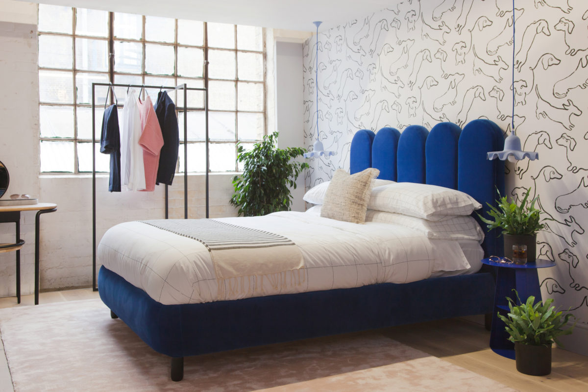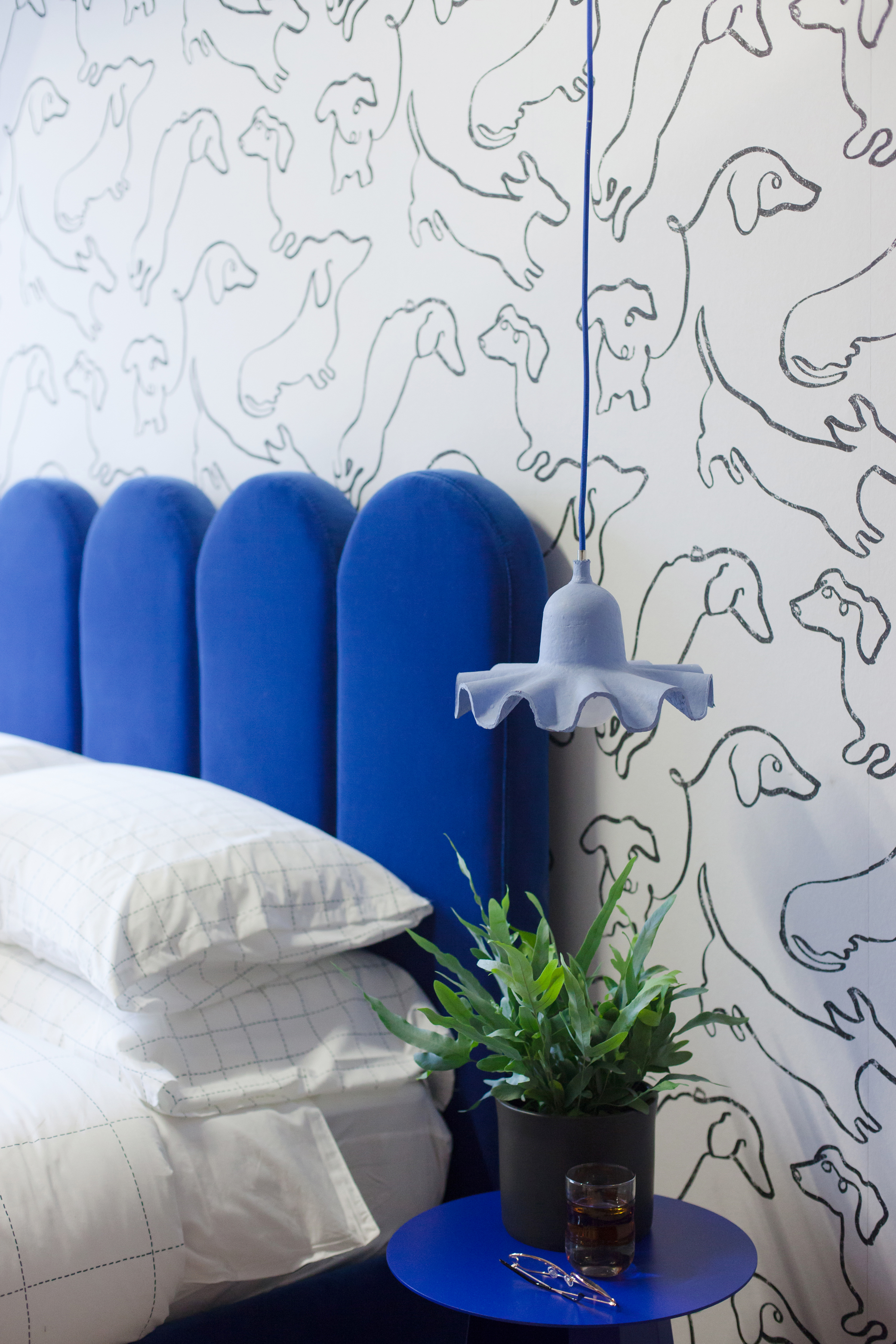 The Luca bed, named after Italian director, Luca Guadagnino, with its accompanying pill shaped ottoman, is a modern arched bed with curved detailing on the base and legs.