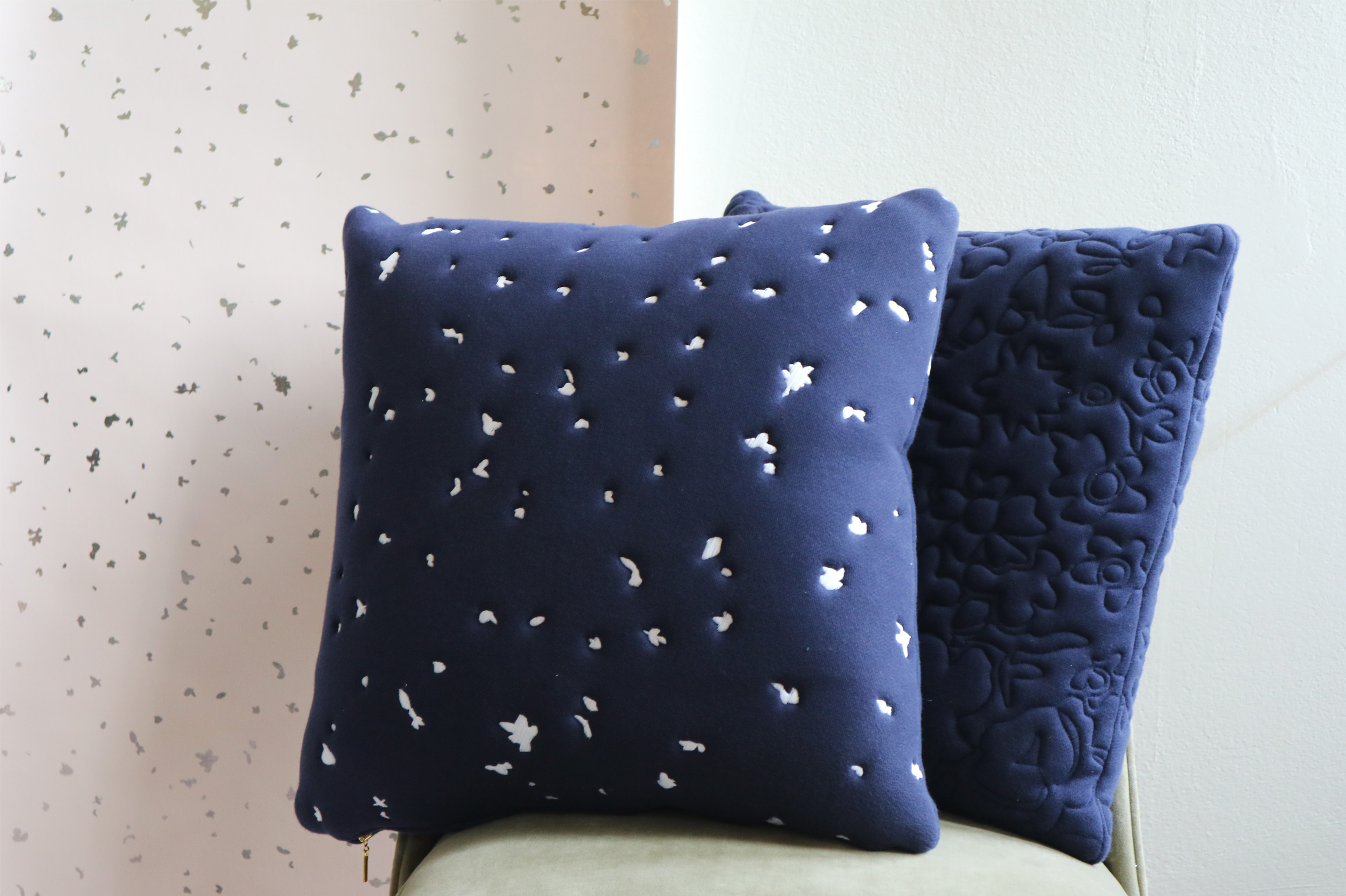 Comprising luxury printed wallpapers, linens and velvets in three designs – Forest, Vale and Fragments – in nine colour ways of greens, blues, pinks and greys. Cushions are also available with embroidery and stitch detail that is a key element to the work of Custhom.