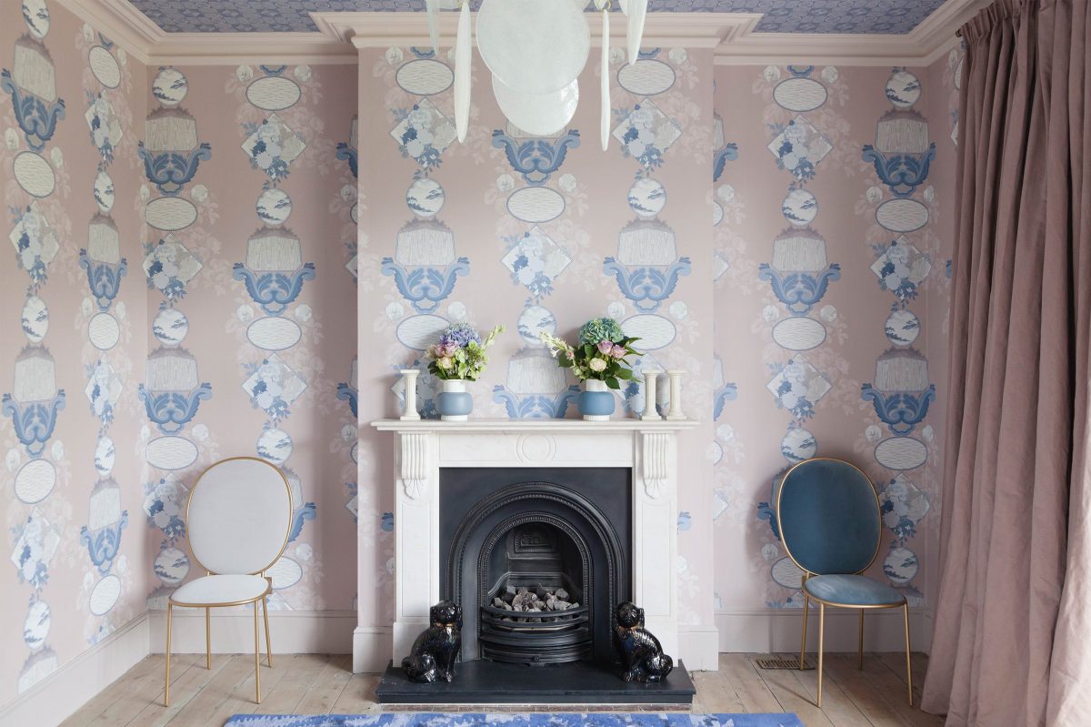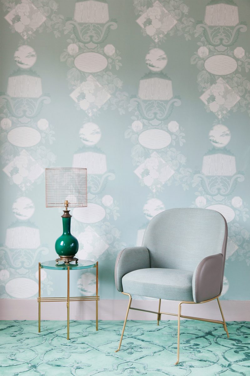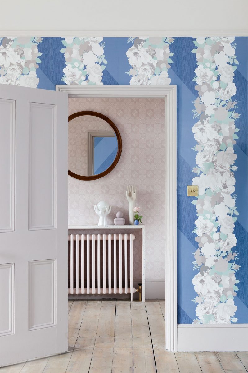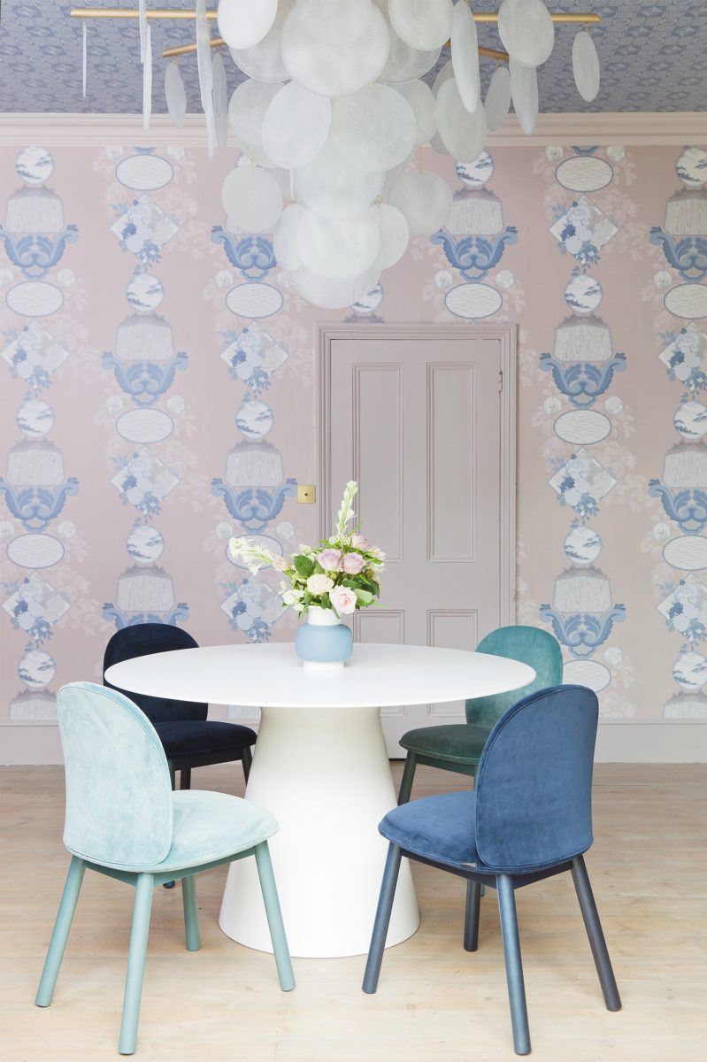 4 designs in 4 colourways: Wonder, Joy, Rebecca, Totem – in Jade Green, Dusky Pink, Warm Grey, and Cornflower Blue. A minimal approach to maximalism with all over use of pattern. We love the idea of using 5 walls, ceilings are so often forgotten and our ‘Wonder’ design makes a great impact there.