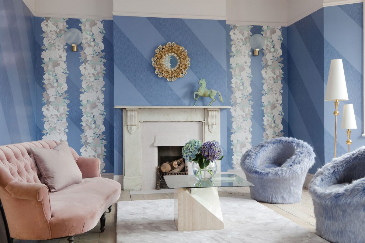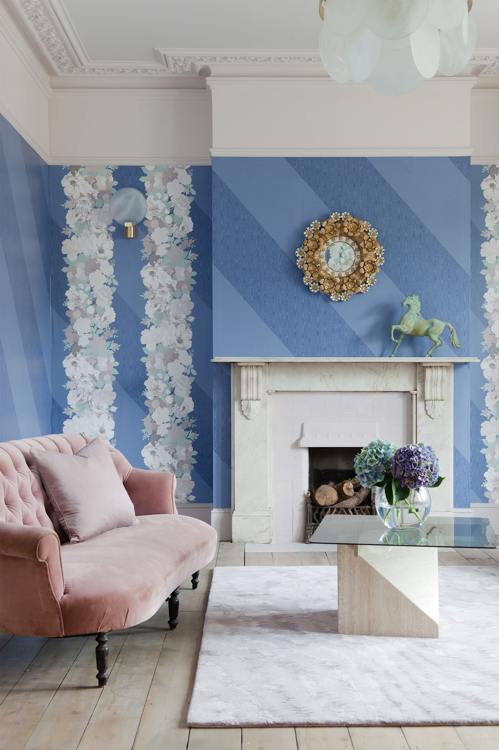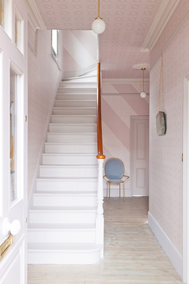 4 designs in 4 colourways: Wonder, Joy, Rebecca, Totem – in Jade Green, Dusky Pink, Warm Grey, and Cornflower Blue. A minimal approach to maximalism with all over use of pattern. We love the idea of using 5 walls, ceilings are so often forgotten and our ‘Wonder’ design makes a great impact there.