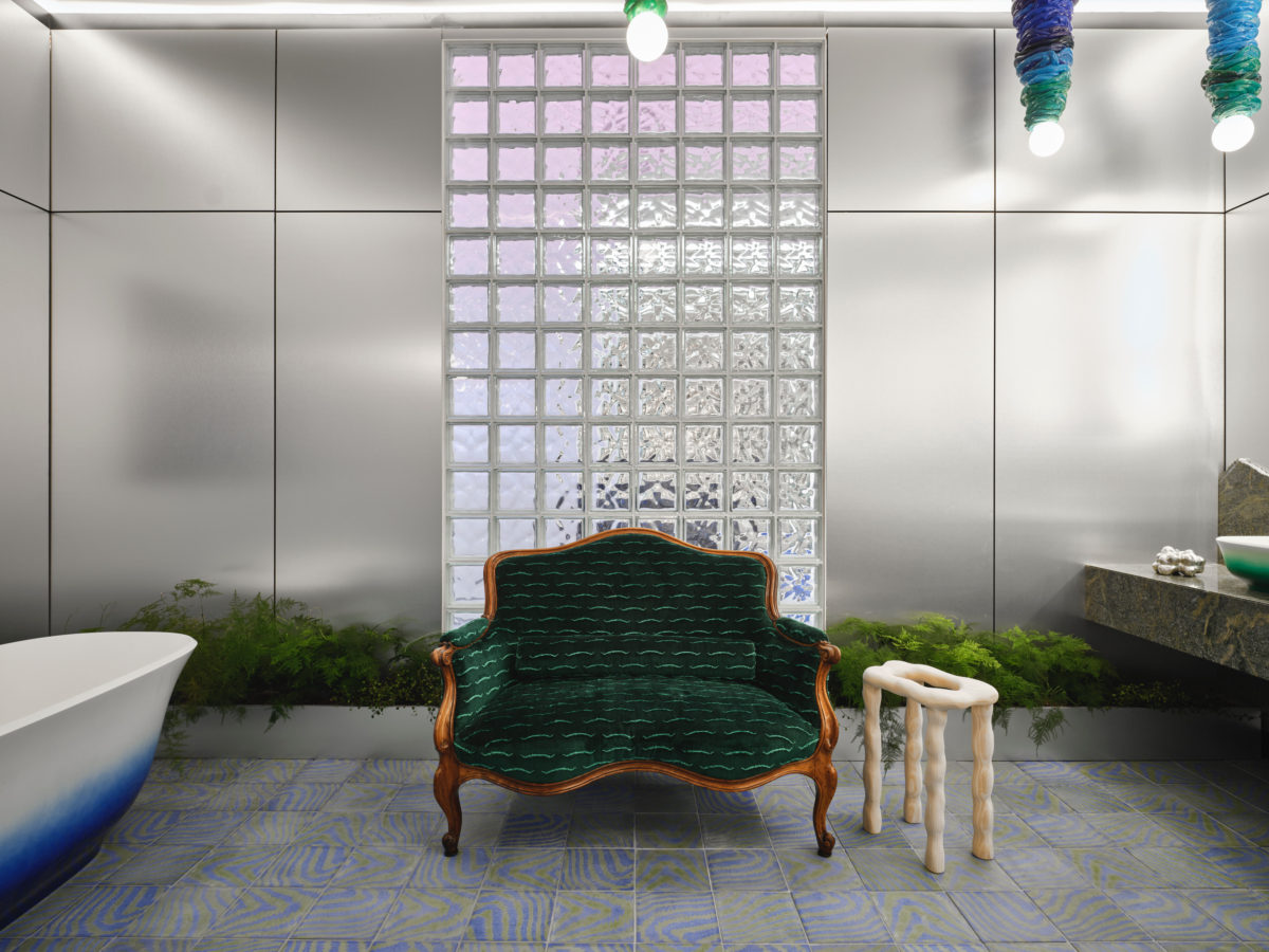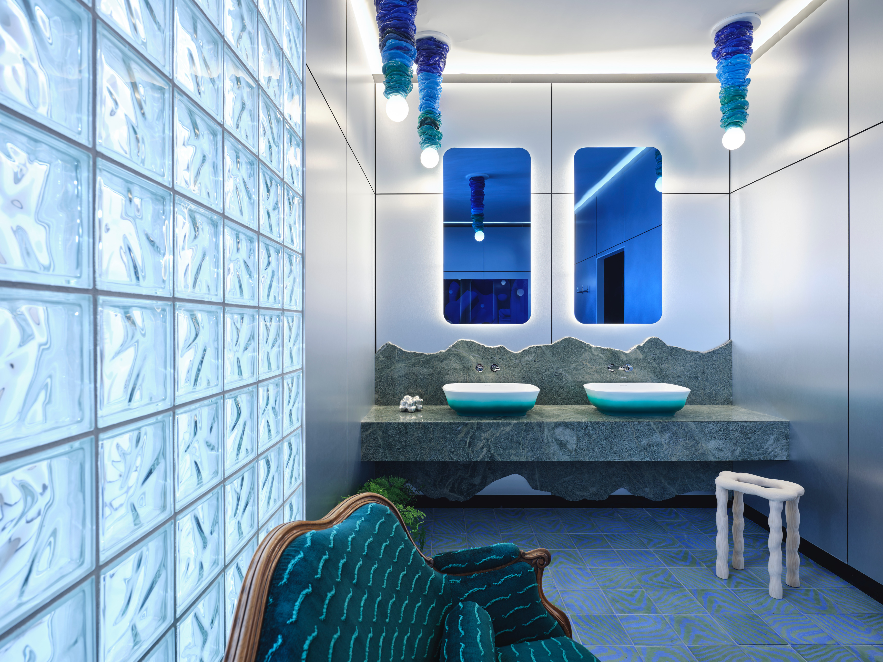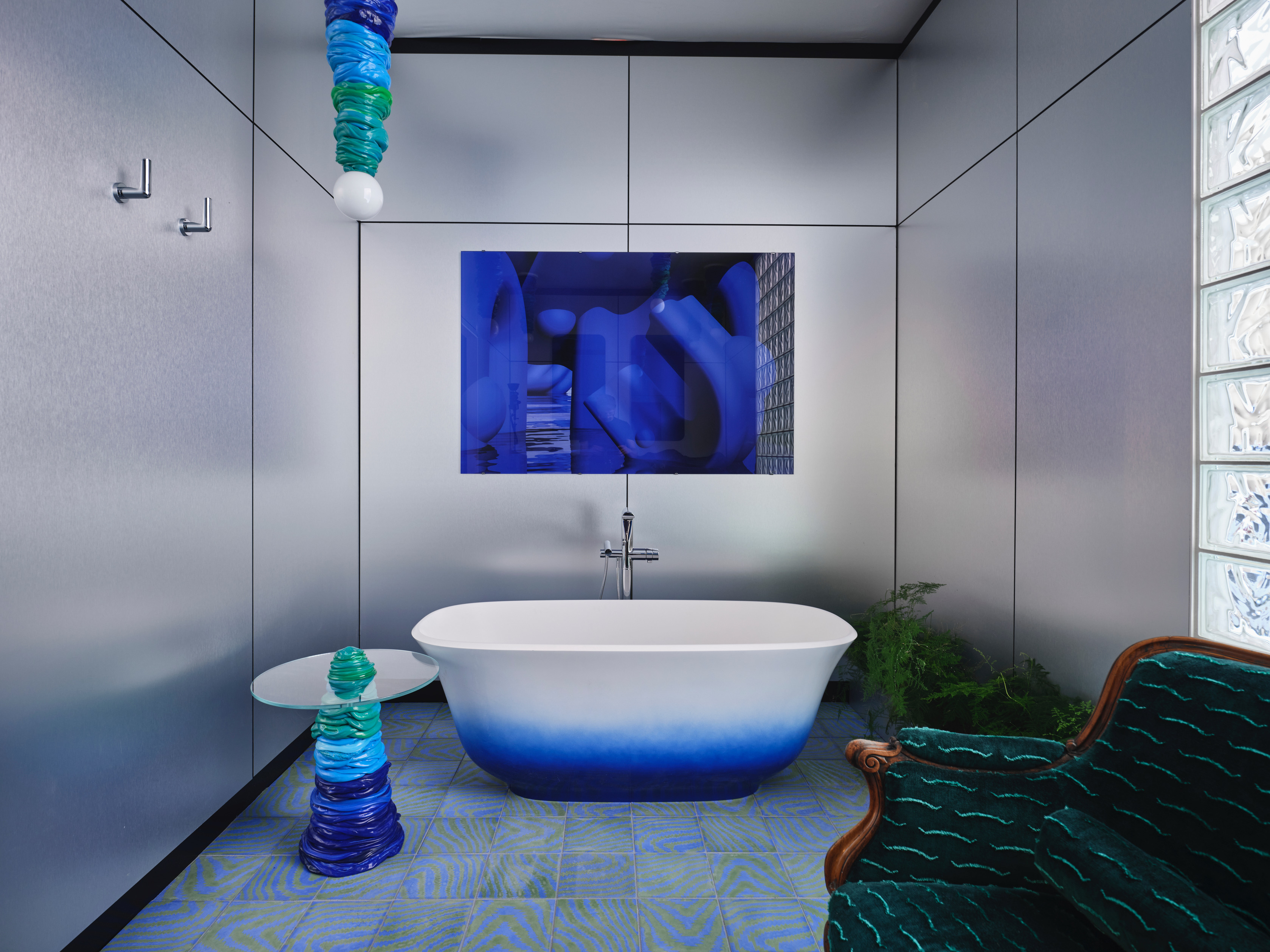 Showcasing a wow factor blue ombre Amiata bath and matching ombre basins in complimentary green – a new collaboration between 2LG and Victoria & Albert Bath, with beautiful Parabola taps by Riobel. Set against a backdrop of stark sheet metal and retro glass brick.