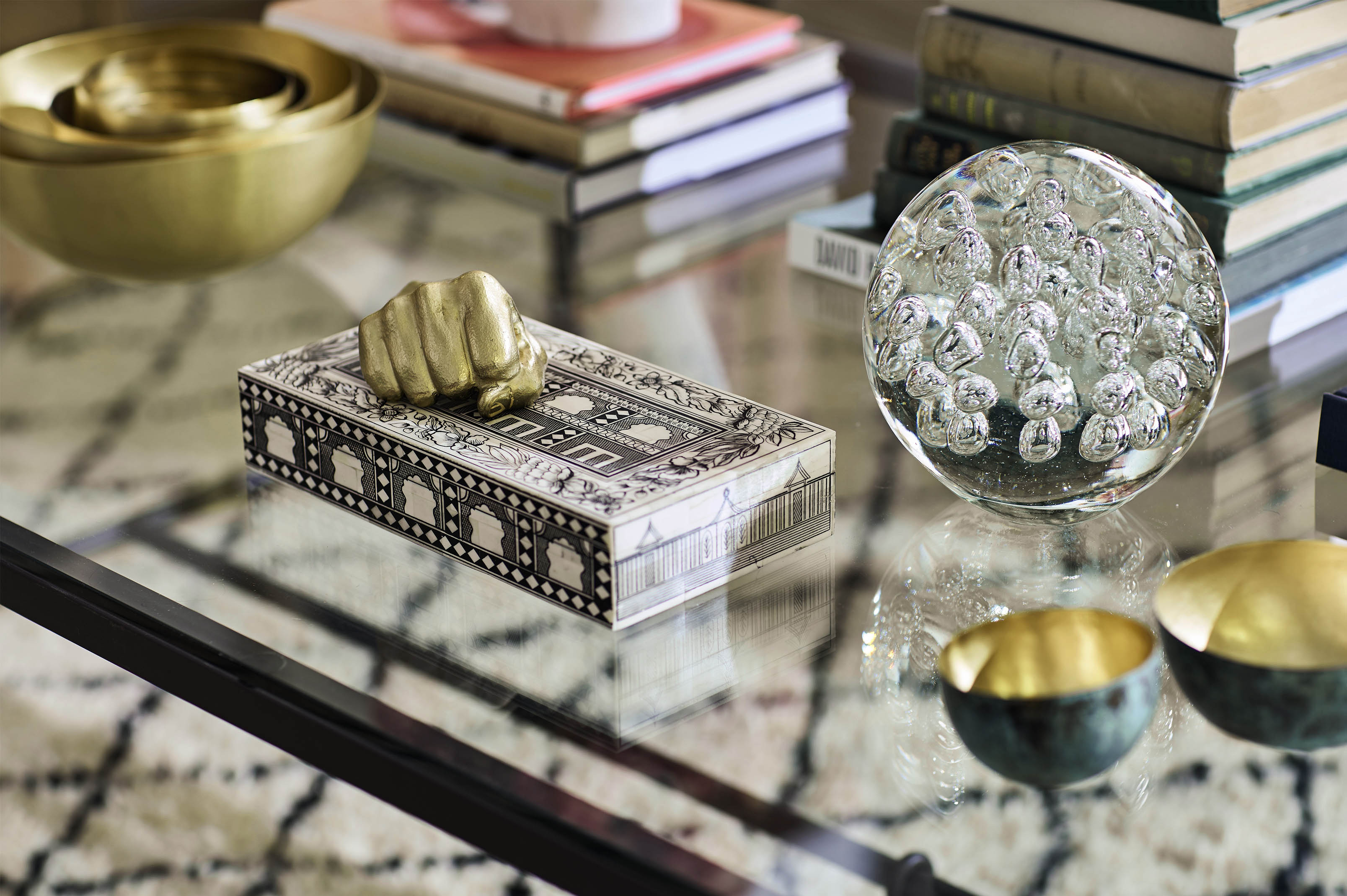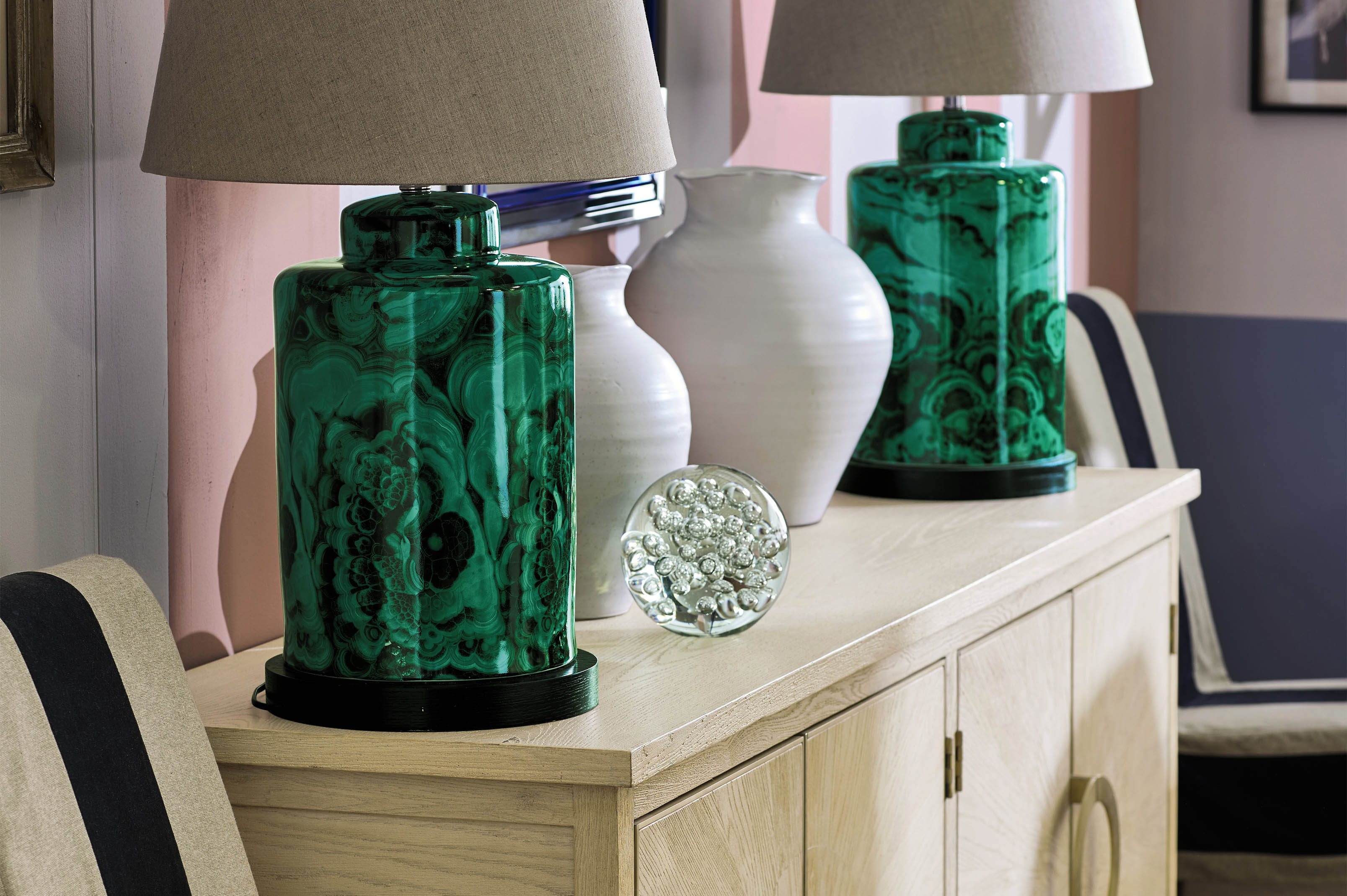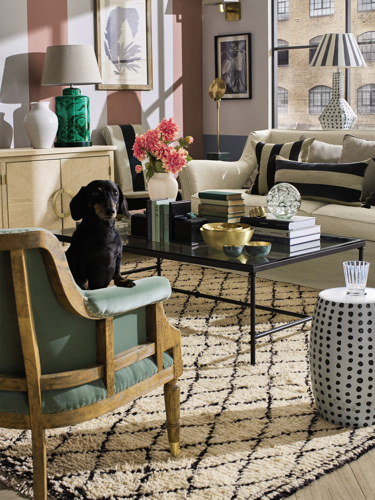 The fine-framed black crittal window gives the space epic light and grounds the more playful colours. We particularly love the oversized Malachite lamps, symmetrically framing the ornate coloured glass mirror.