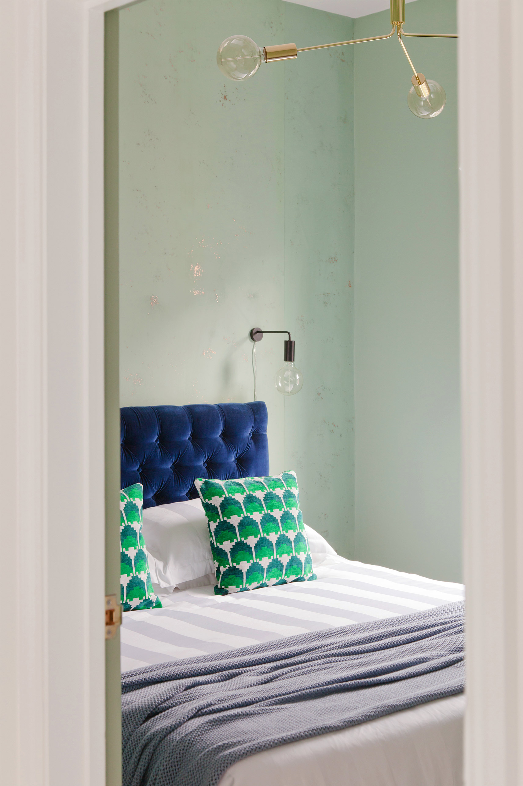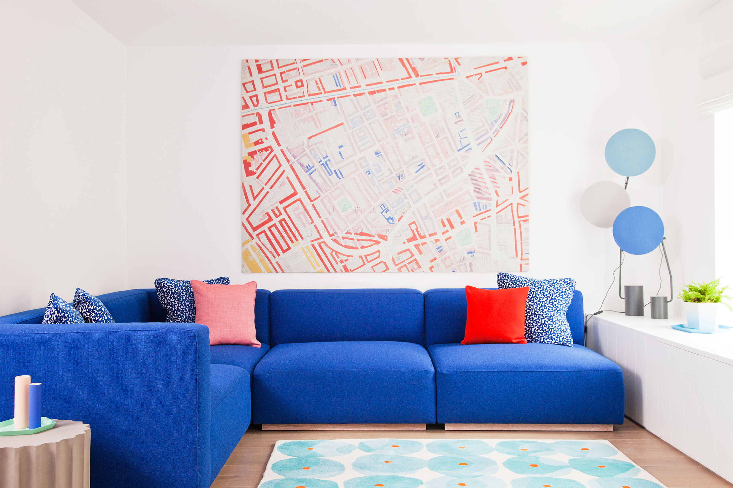This 3 bed, new-build house in a nook at the end of a terrace of victorian houses, had great light and space but needed a fresh injection of life, as the white walls did not reflect the exuberance of our clients. We redefined each space giving it a clear function with the striking blue bespoke sofa making this a sleek party pad with enough room for entertaining family and friends.