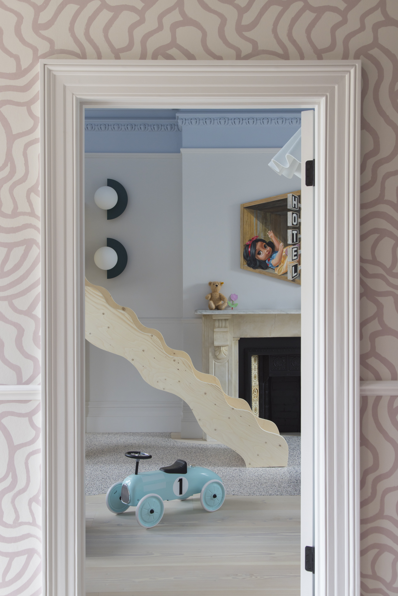 Long wide boards create unity throughout the spaces with excess boards then used to make bespoke joinery in several spaces. Adding a natural soul throughout that unites the bolder elements of the interior design. The ornate details of the original features bring history to the spaces whilst the circle motifs and wiggle shapes in the stair carpets, play house and wallpaper add a touch of playfulness to an otherwise serious house.