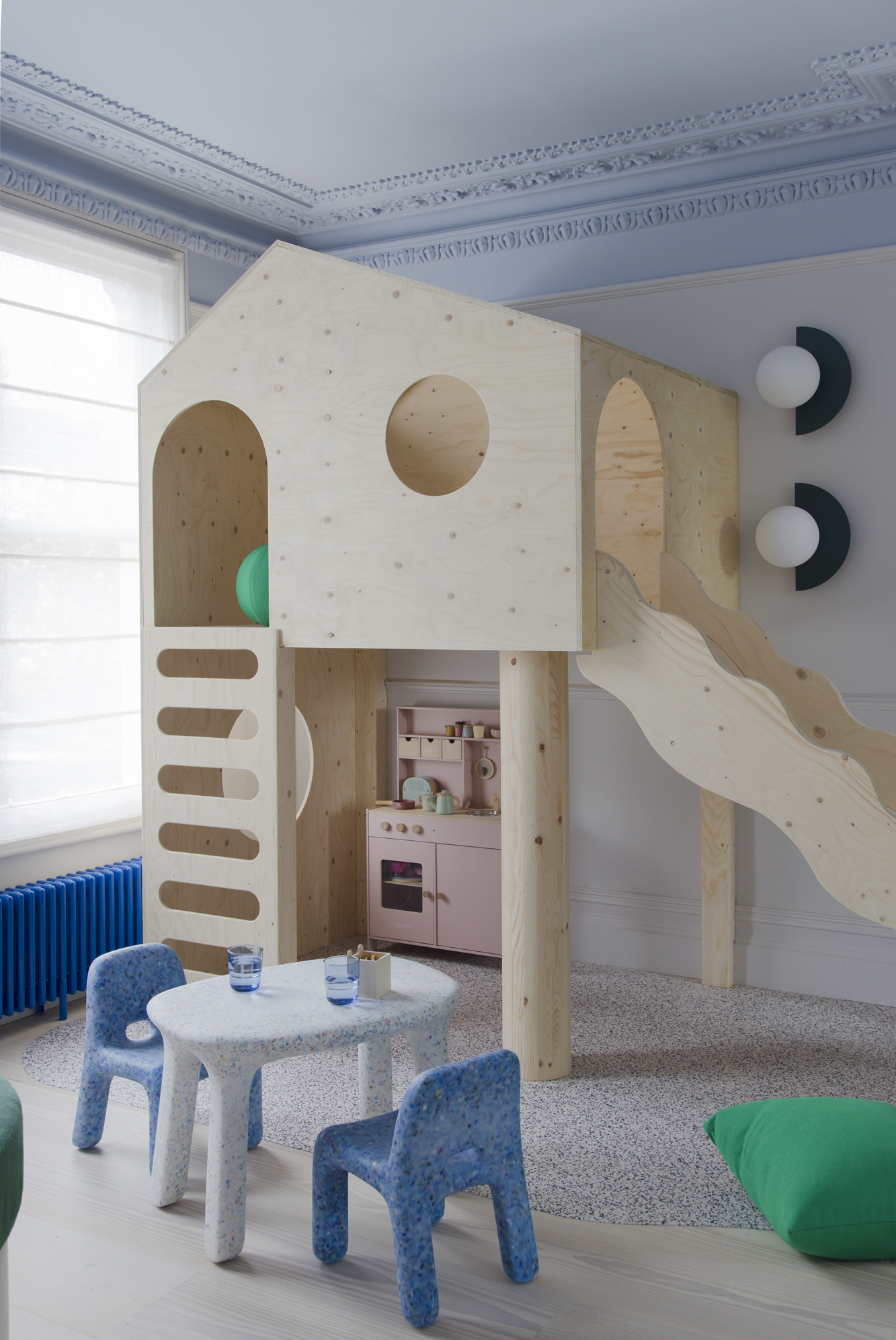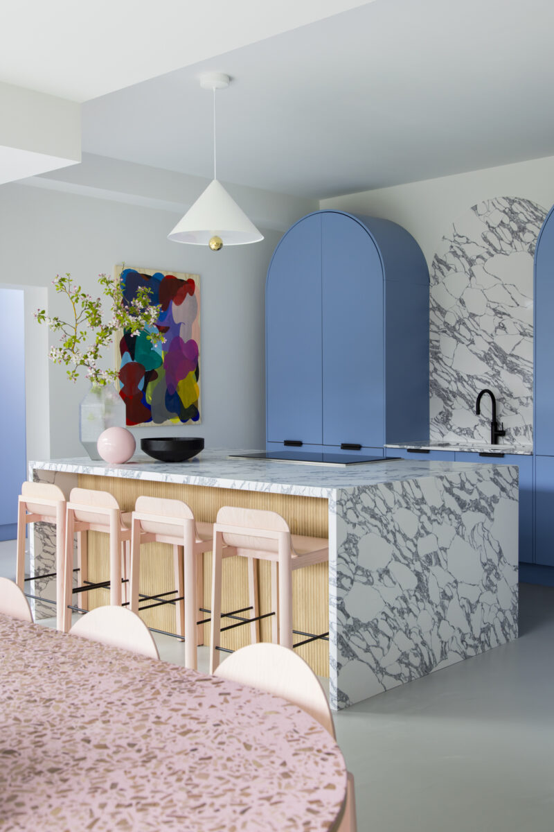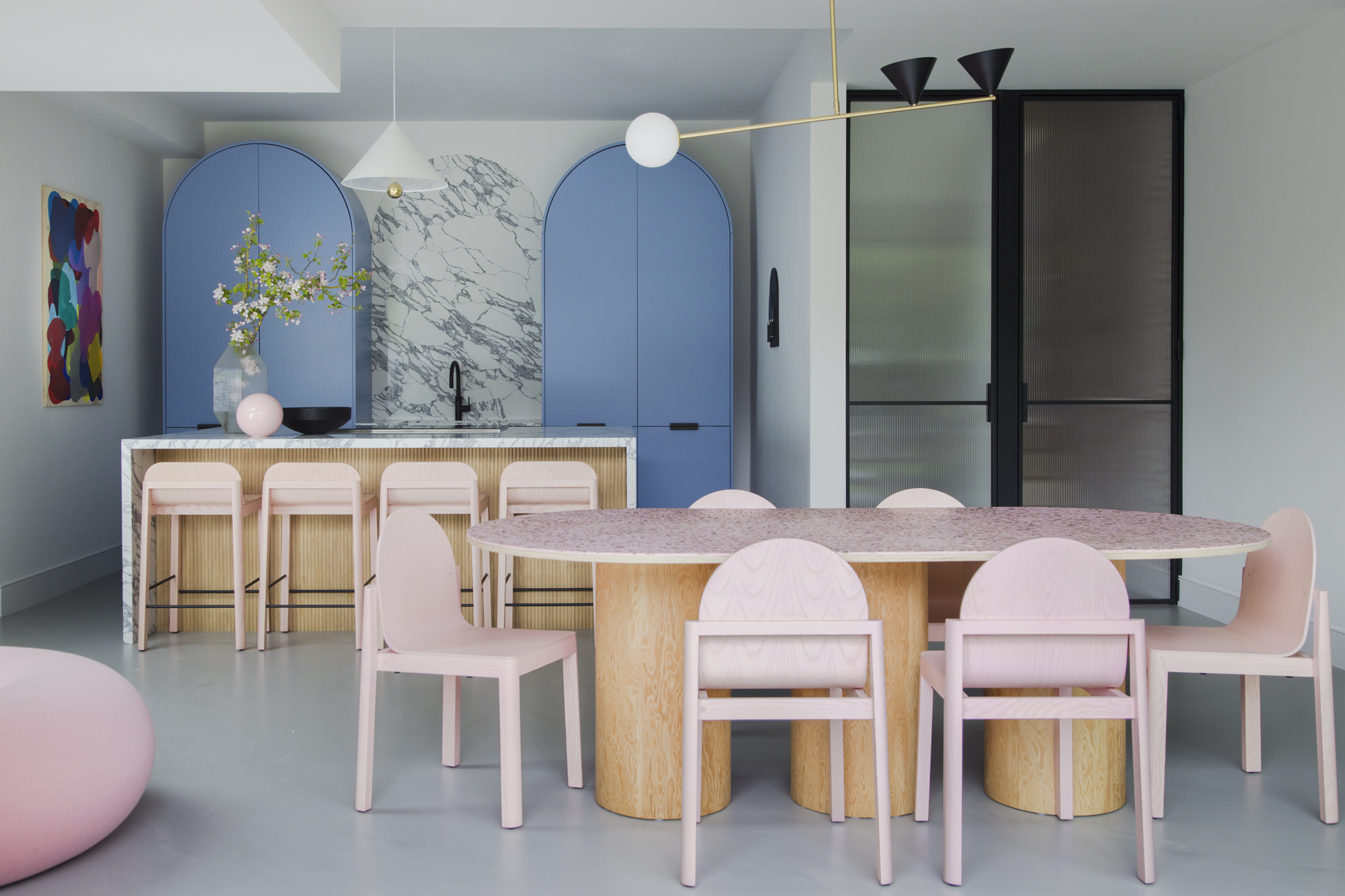 The Sky blue kitchen cabinetry elevates the classic kitchen into the modern aesthetic. Combining with the pink of the stained wooden furniture and the urban pale grey of the poured floors. The blues gets deeper and bolder as you move upstairs into the study and then the family bathroom, directly above the kitchen. Creams and beiges also play a roll in creating calmness and warmth in the colour palette. Pastel green in the baby’s room is serene and fresh. Warmed up with a mix of wood tones and creams. Primary red gives structure to the colour palette in details of the living space.