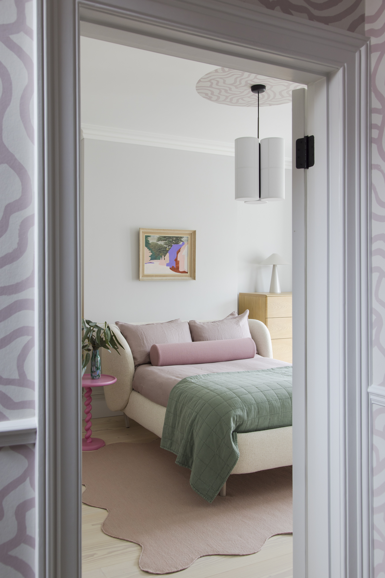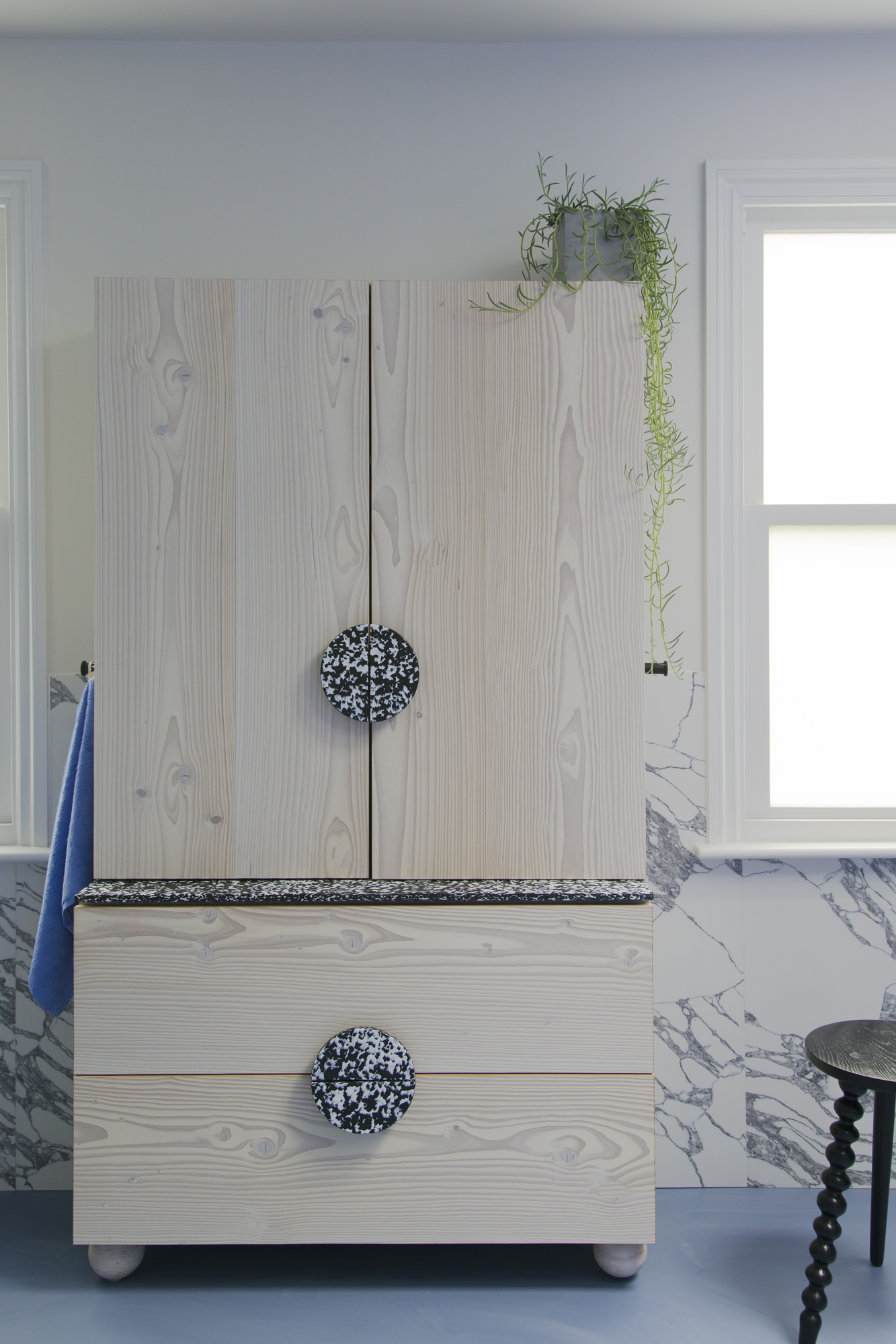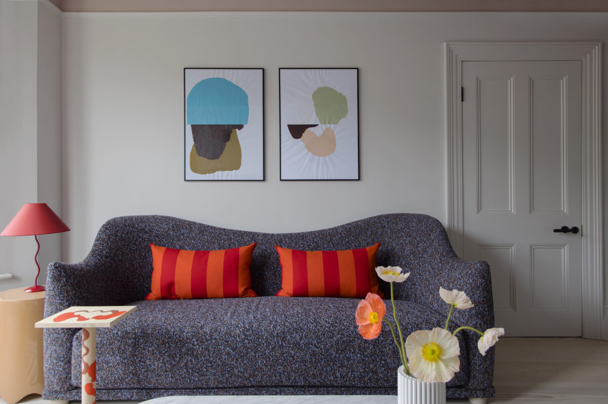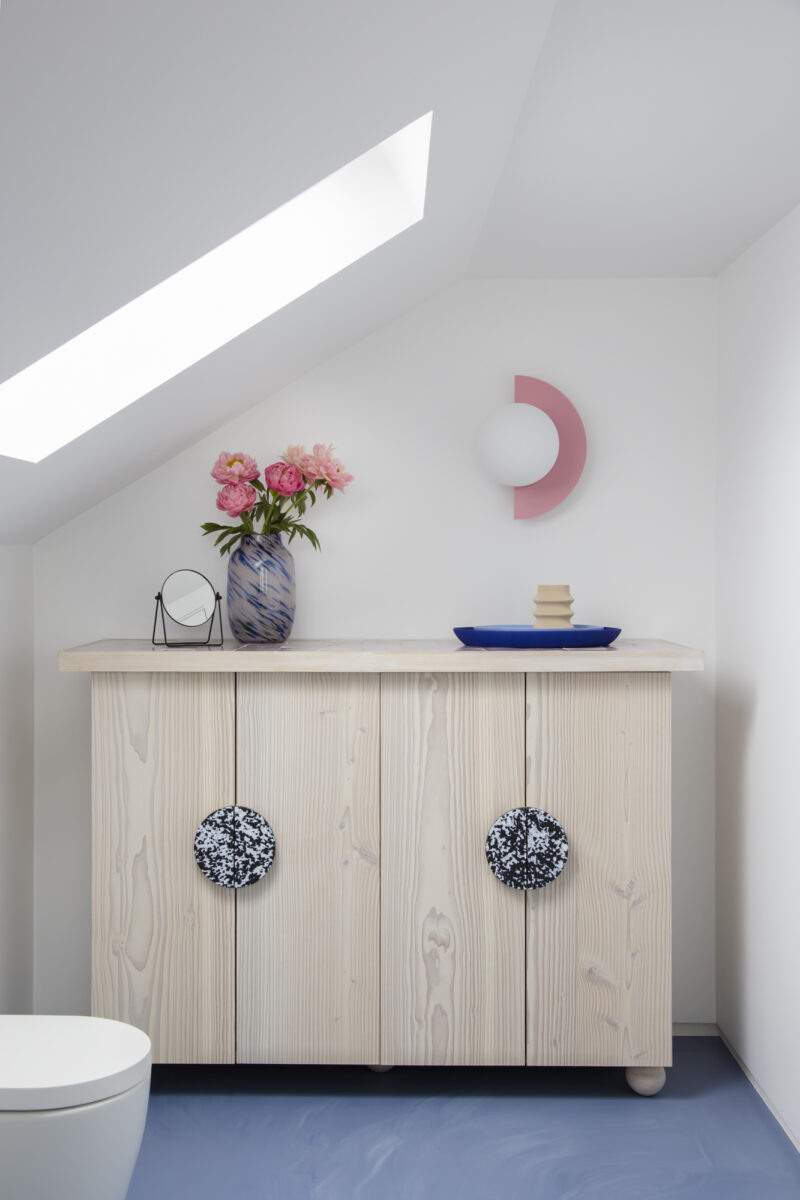 The furniture in this project is a mix of bespoke joinery, bespoke upholstery and carefully curated bought pieces. Many pieces are designed by 2LG Studio themselves; the Tilda sofa, design by 2LG for Love Your Home, is seen here in Raf Simmons for Kvadrat; the bespoke dining table was designed by 2LG using Pink Foresso for the top. (A solid surface made from waste wood chippings and resin); the Luca bed head (loft bedroom) is another design by 2LG for Love your home; rugs throughout are by 2LG studio for Floorstory. Including their wiggle pill, portal and moire designs; a bespoke bathroom cabinet made from leftover Douglas Fir boards with Smile plastics details.