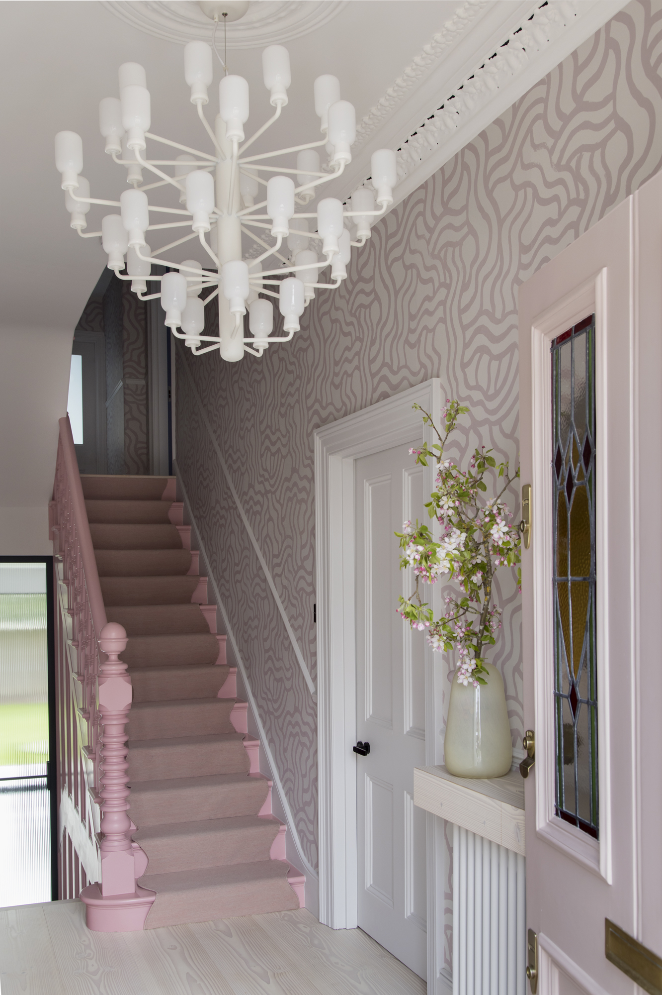 Hand printed wallpaper designed by 2LG Studio with their longterm collaborators and friends, Custhom Studio. Made in a bespoke colourway for this project. Installed throughout all the hallways and stairs. The wallpaper creates impact from the moment your enter the property. Giving character but also carrying that character up throughout every part of the house over 3 floors as it winds up the walls around the staircase and hallways.