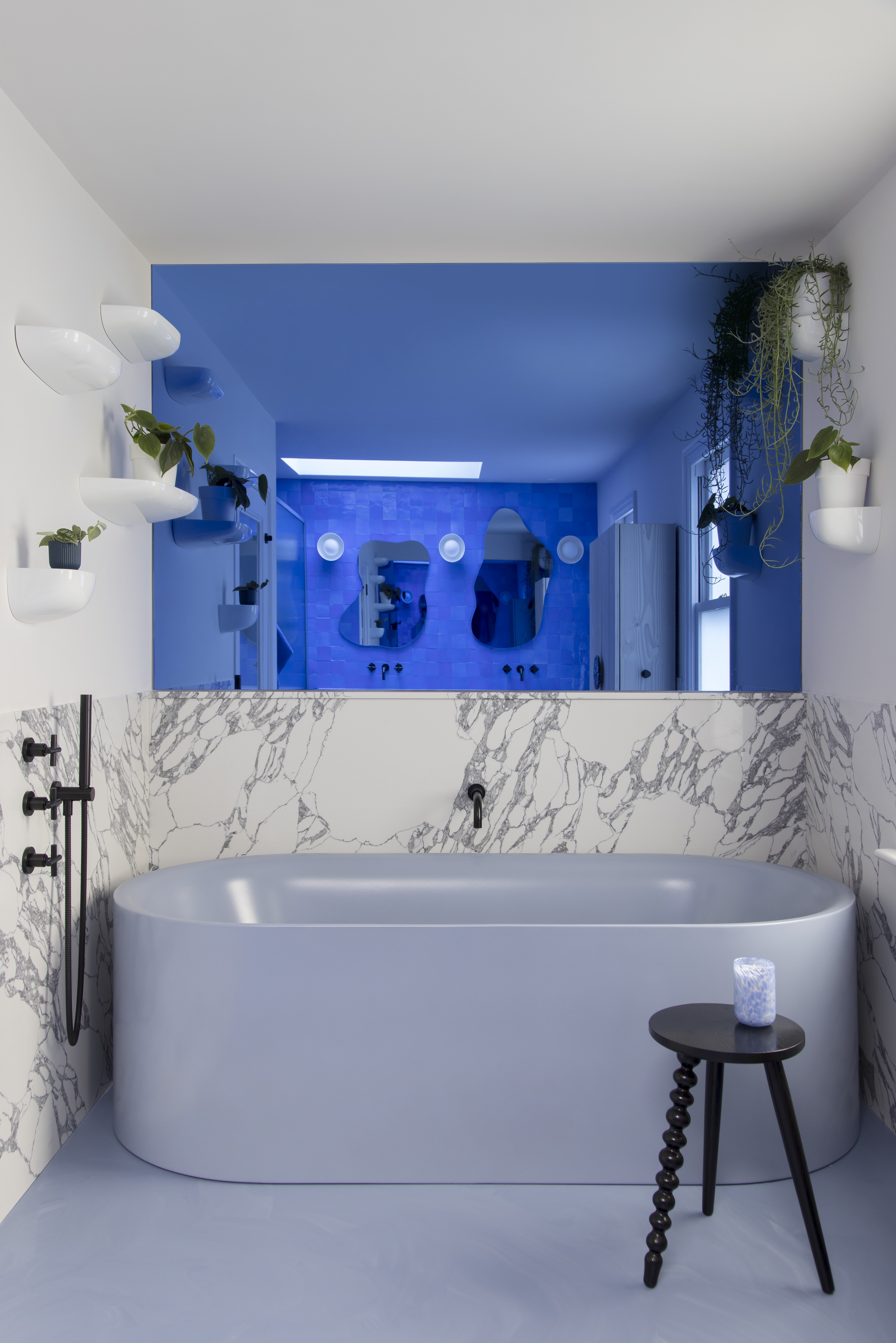 Handmade cement tiles in Moire design from our new collection for Maitland and Poate give character, colour and texture to the ‘white box’ extension at the back of the property. This motif is tied through into the front living space or snug with a bespoke rug, also designed by 2LG for Floorstory. The bold burgundy veined marble of the minimal fire surround in the sophisticated snug at the front of the property connects with the marble detail in the kitchen and family bathroom.