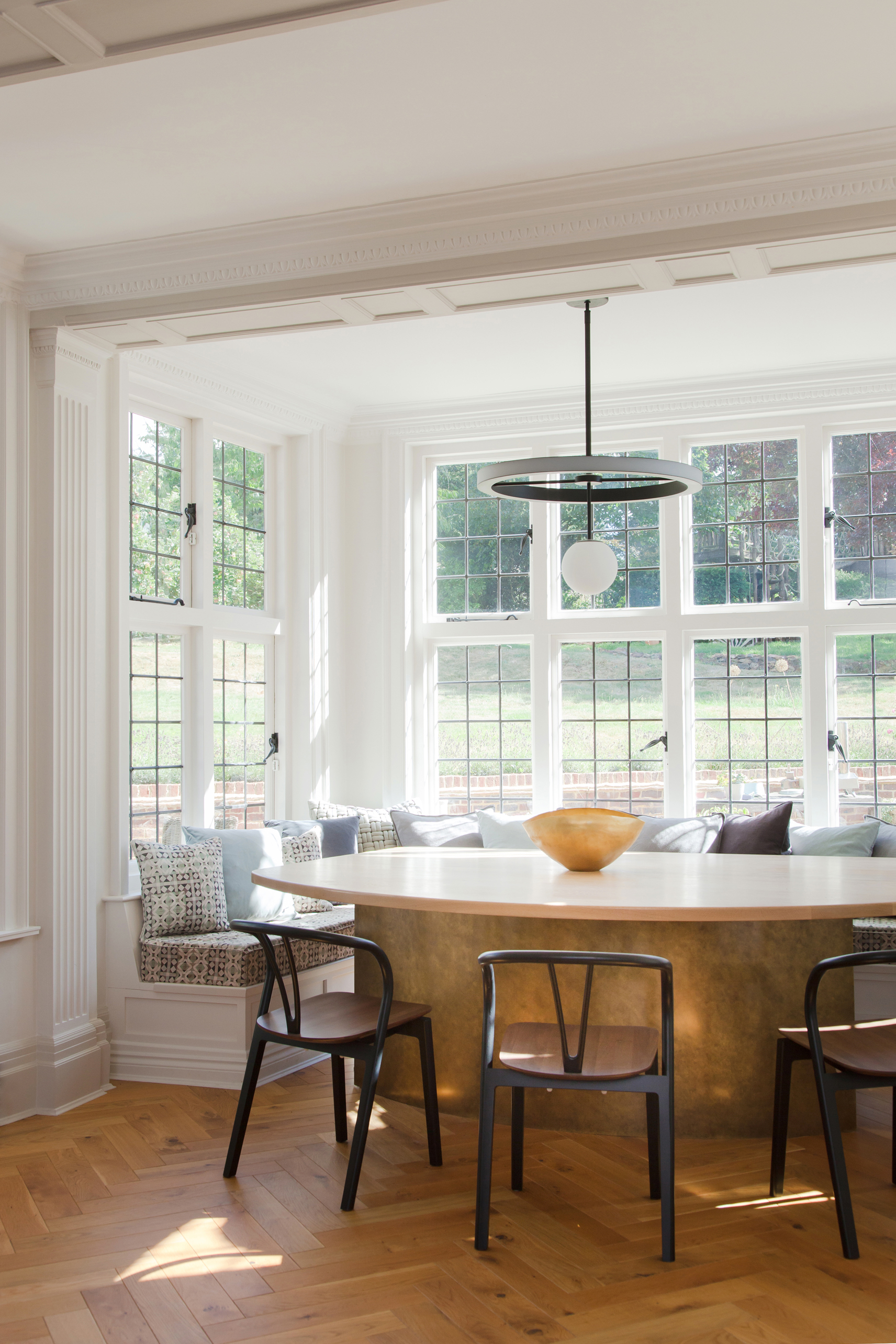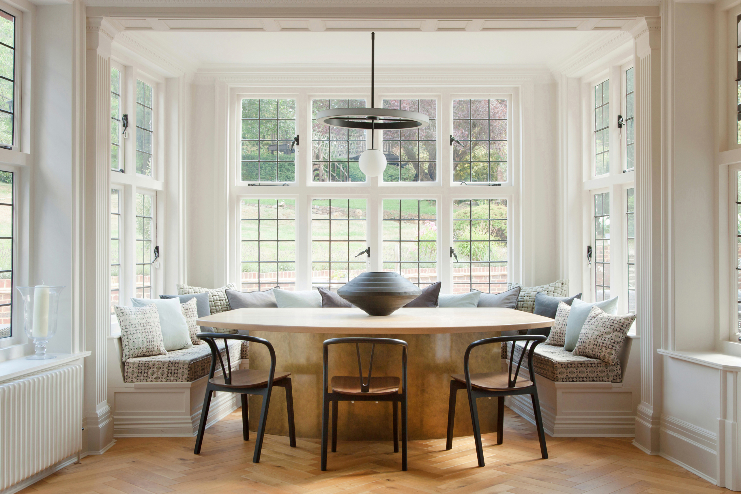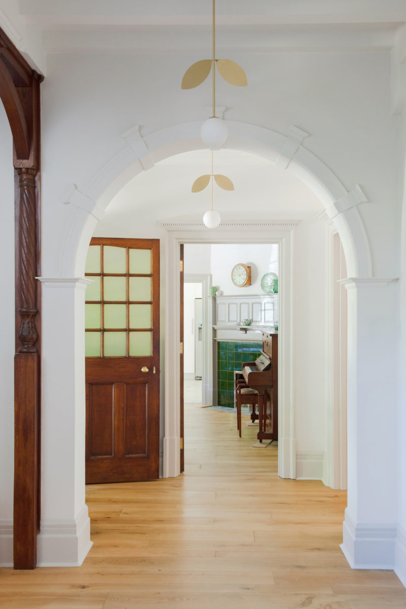 A bespoke brass and oak dining table, commissioned by us from british design brand, Novocastrian, with contemporary chairs by Ercol, becomes the centrepiece of the home. The Liberty of London upholstery on the banquet seating giving another nod to the cultural heritage of the property. The lighting in the hallway, and throughout in brass and black metal, has a leaf motif that is entirely appropriate for the Arts & Crafts movement, yet adds a modern wit. The craftsmanship in the lighting of Pinch, seen in the sitting room and music room, creates a strong story of craft to be handed down through generations, without ever being taken too seriously.