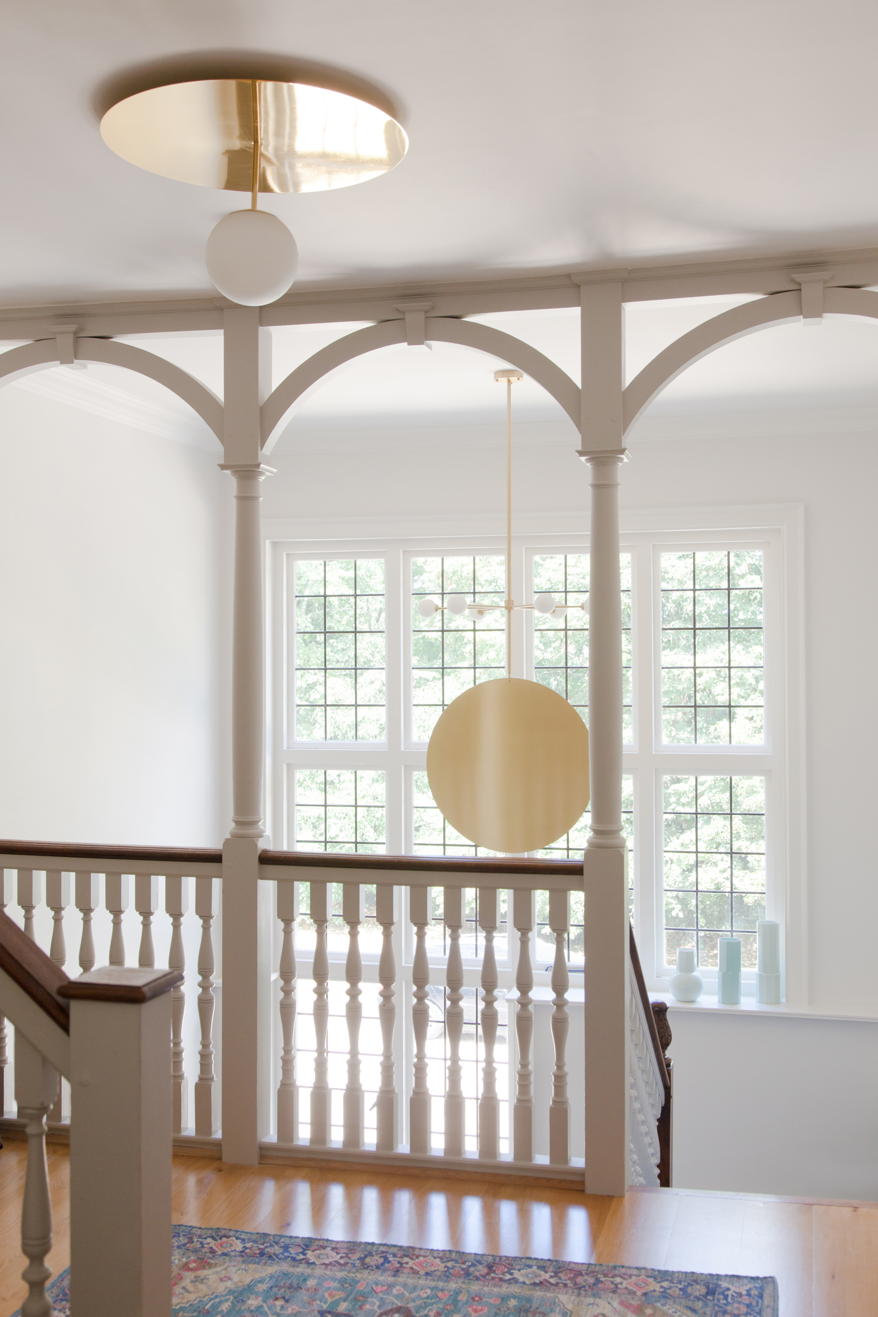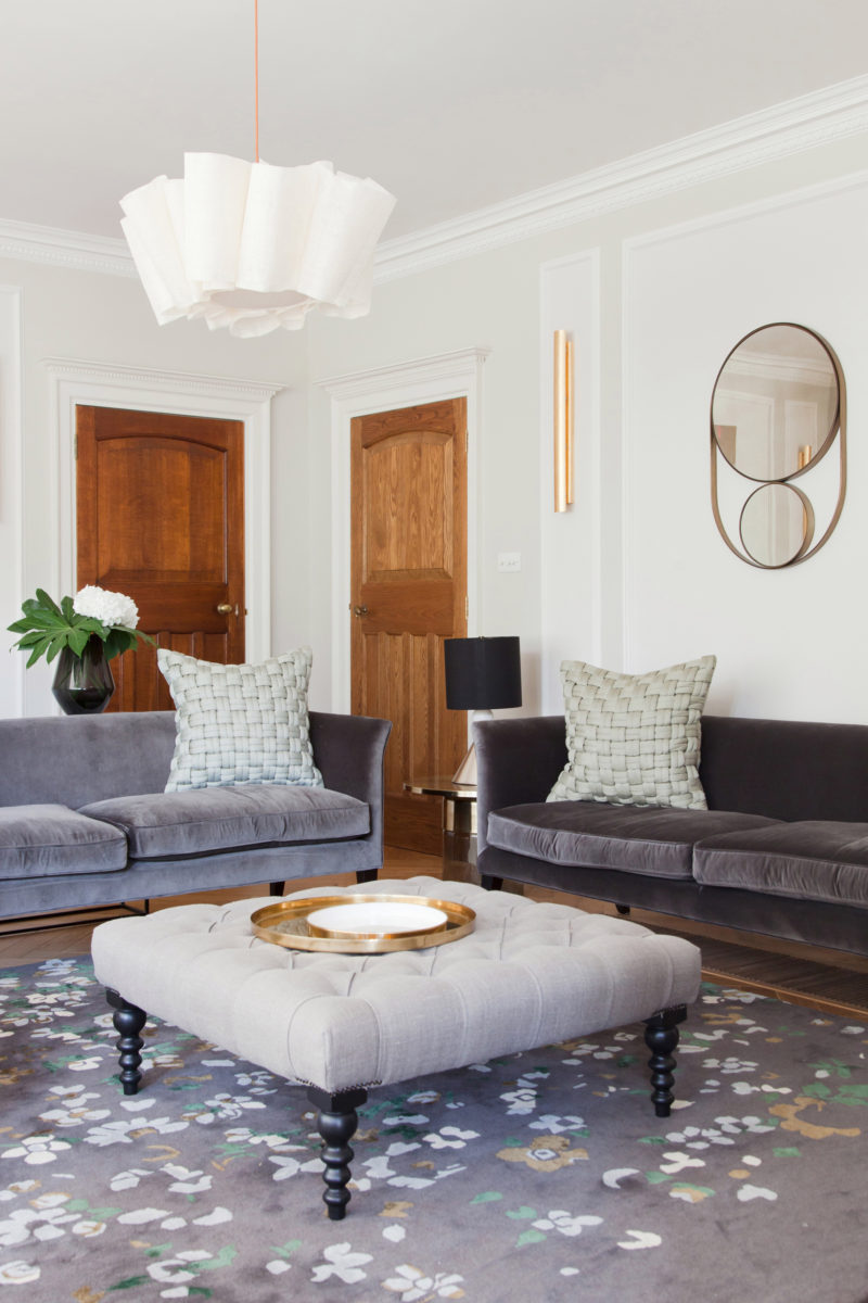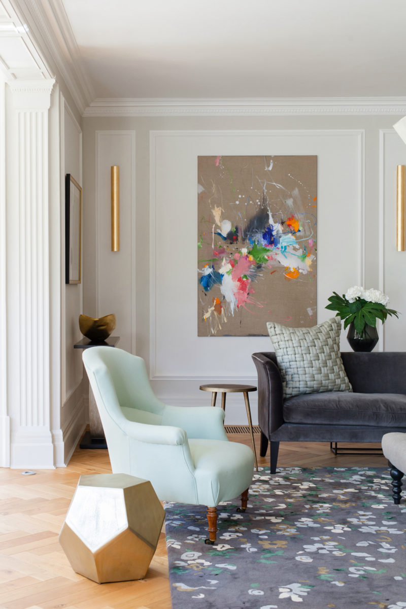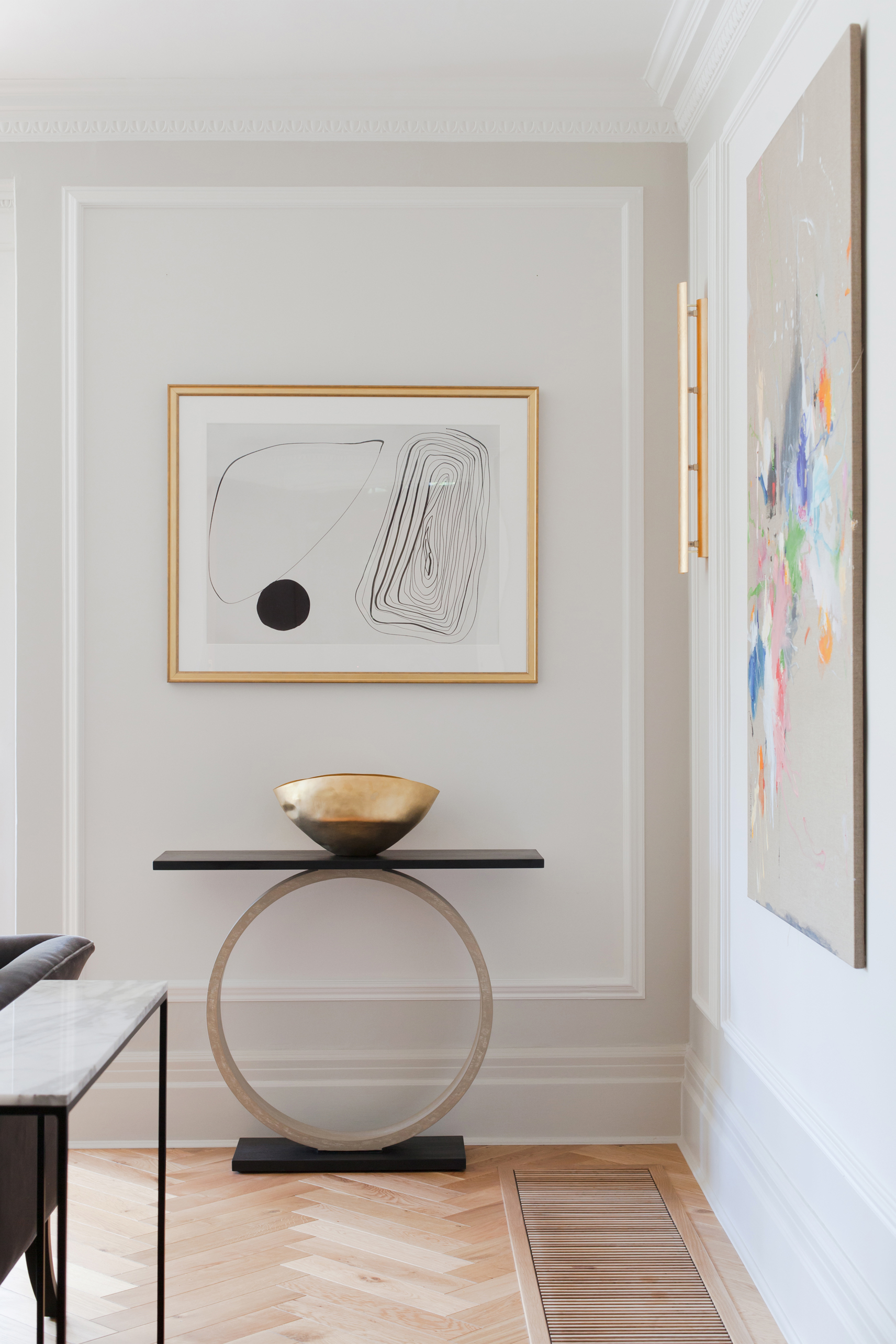 A bespoke brass and oak dining table, commissioned by us from british design brand, Novocastrian, with contemporary chairs by Ercol, becomes the centrepiece of the home. The Liberty of London upholstery on the banquet seating giving another nod to the cultural heritage of the property. The lighting in the hallway, and throughout in brass and black metal, has a leaf motif that is entirely appropriate for the Arts & Crafts movement, yet adds a modern wit. The craftsmanship in the lighting of Pinch, seen in the sitting room and music room, creates a strong story of craft to be handed down through generations, without ever being taken too seriously.
