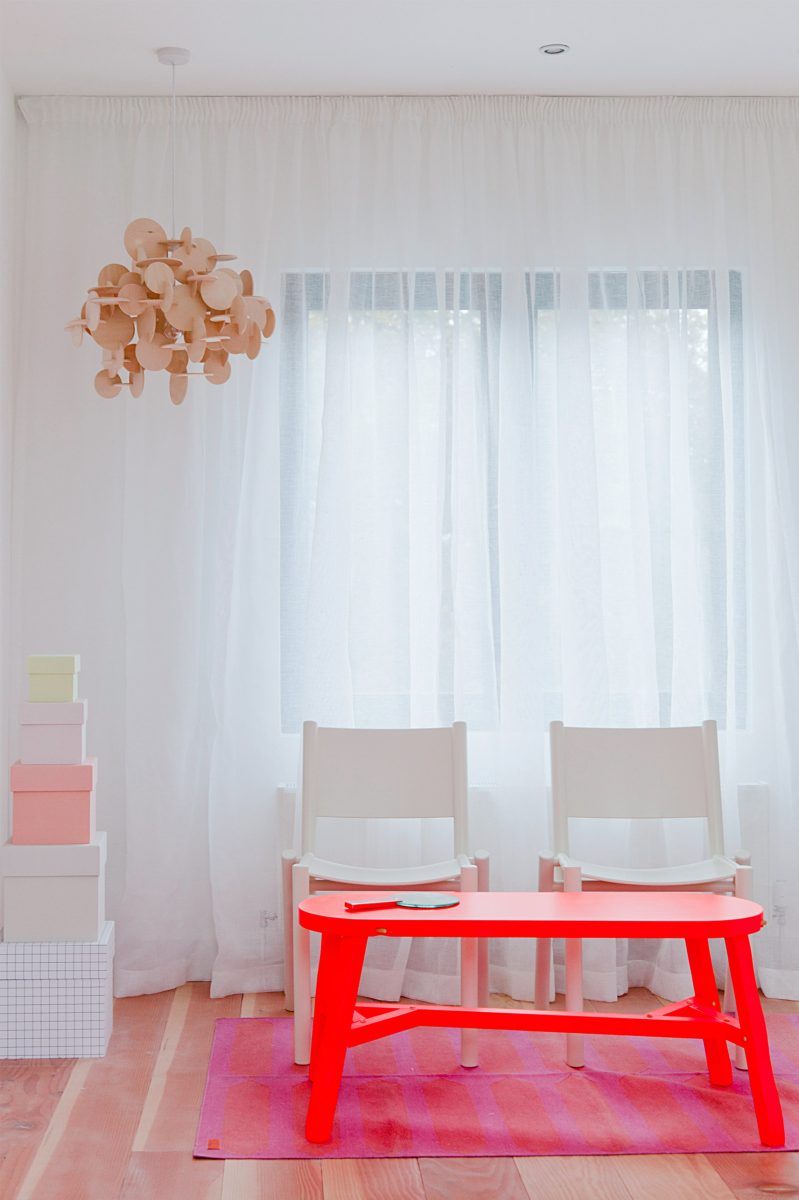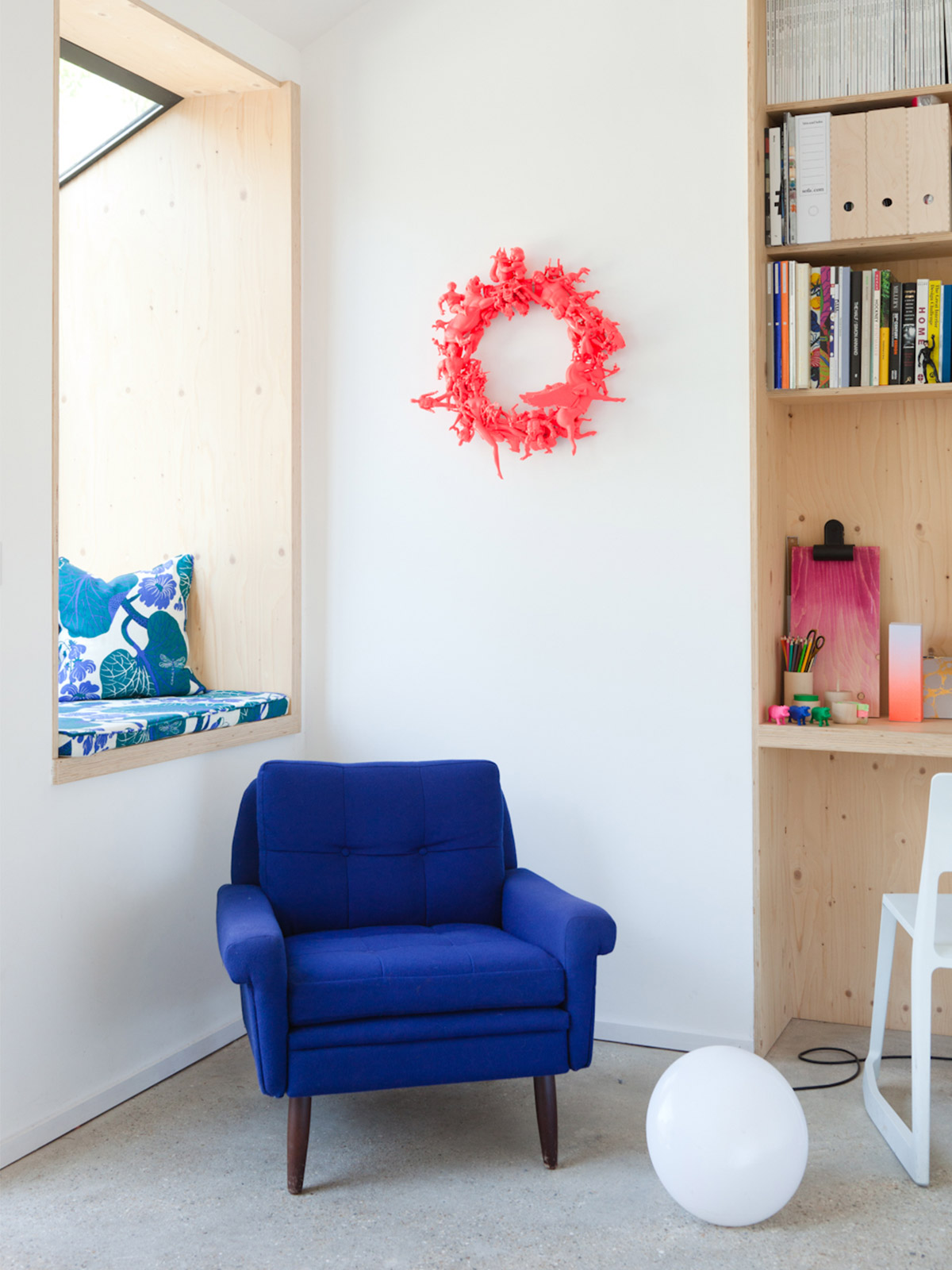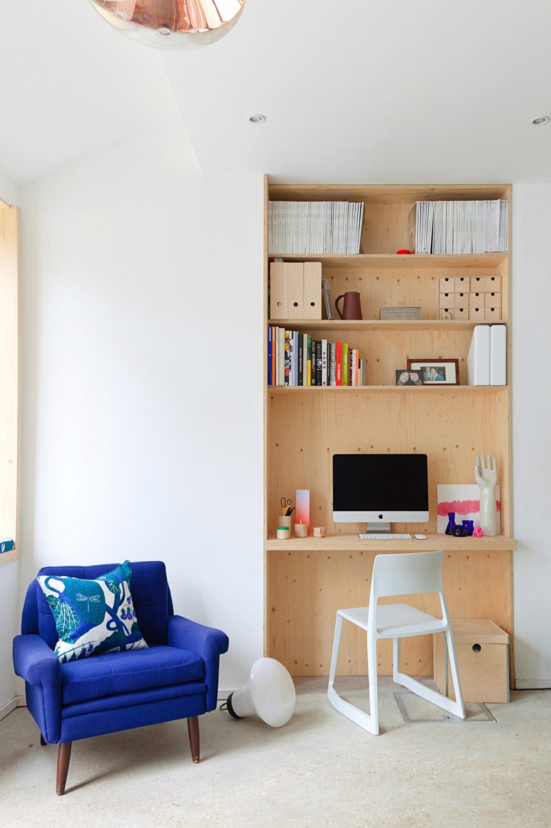 The home has a throughline of materials and colours – soft pink used here as a neutral base, connects all the elements and we designed bespoke plywood joinery throughout to unite the spaces and create much needed storage.